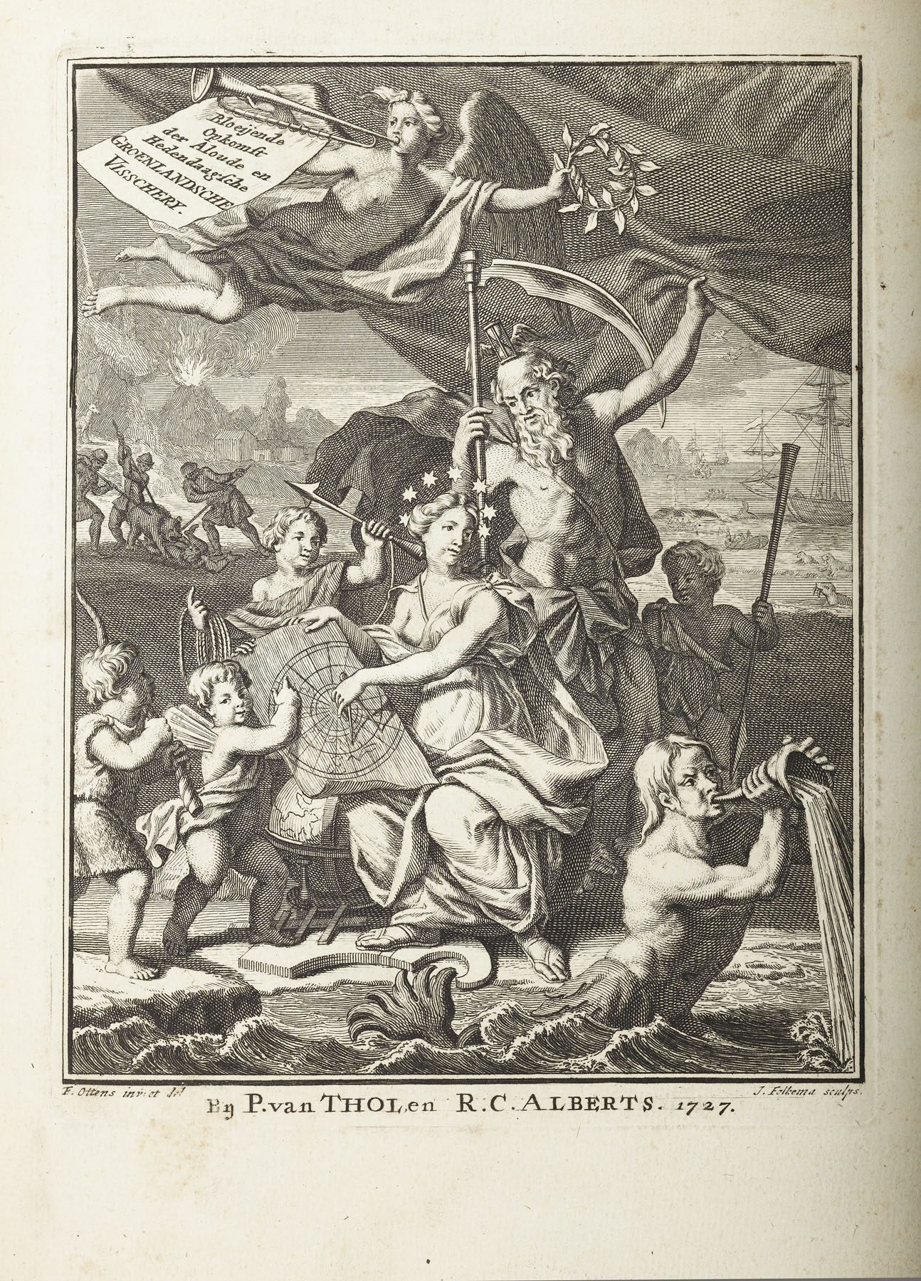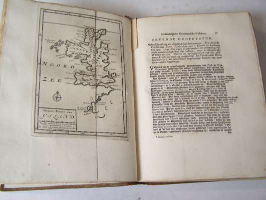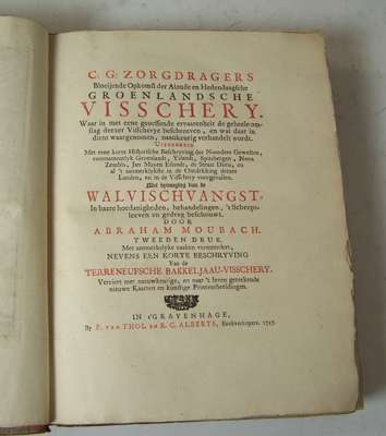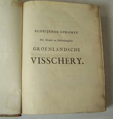Bloeijende opkomst der aloude en hedendaagische Groenlandsche Visschery.... The Hague: P. van Thol & R.C. Alberts, 1727. Second edition, 4to, half title, verse, engraved title, title in red and black, [*-***4, A-Ggg4], 6 maps, 10 [of 11] plates, 18th century calf gilt, rebacked, rubbed and scuffed, interior very clean, Northern Lighthouse stamp on board