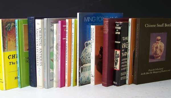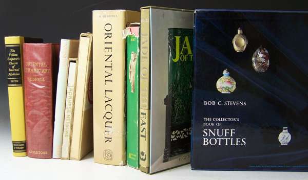 Moss, H., Graham, V. and K.B. Tsang. The Chinese snuff bottle. New York, 1993. 2 vol., folio, slipcases; White, Helen Snuff bottles from China. The Victoria and Albert Collection. 1992. Folio, dust-jacket, slipcase; Moss, Hugh Chinese snuff bottles from the collection of the Rt. Hon. the Marquess of Exeter. 1974; Moss, H.M. Chinese snuff bottles of the silica or quartz group. 1971; National Palace Museum, Taipei. Masterpieces of Chinese snuff bottles in the National Palace Museum. 1974. Slipcase; [Idem] Snuff bottles in the collection of the National Palace Museum. 1991; Hansford, S.H. Jade. Essence of hills and streams. 1969. Dust-jacket; Kleiner, Robert An exhibition of Chinese snuff bottles from the collection of Mary and George Bloch. 1987. 4to, dust-jacket; Kleiner, Robert Chinese snuff bottles in the collection of Mary and George Bloch. 1995. 4to, dust-jacket; Kleiner, Robert Precious playthings: important Chinese snuff bottles from the Mack Collection. 2000. 4to, dust-jacket; Kleiner, Robert Chinese snuff bottles. The White Wings Collection. 4to, dust-jacket; Hall, Robert Chinese snuff bottles III [ and IV] . 1990-91. 2 volumes, 4to, dust-jackets; Hobson, R.L. The art of the Chinese potter. 1923. 4to, original buckram; Kleiner, Robert Treasures from the sanctum of enlightened respect. 2000. 4to, dust-jacket; Hall, Robert Chinese whispers. Chinese snuff bottles IX. 1999, 4to; Feddersen, M. Chinese decorative art. 1961; Herberts, K. Oriental lacquer. 1962. 4to, dust-jacket; Zee-Min Lee, J. Chinese Potpourri. 1961; Perry, Lilla S. Chinese snuff bottles. Rutland, 1960. 4to, dust-jacket, in original packaging; Li, Ramond A glossary of Chinese snuff bottle rebus. Hong Kong, 1976; [Idem] Snuff bottle terminology. 1981; [Idem] Chinese snuff bottle themes. 1983; [Idem] The miniature arts in China. 1988; [Idem] The medicine snuff bottle collection.1979; [Idem] The art of imitation in Chinese snuff bottles. 1985; Chu, A. & G. Oriental antiques and collectables. 1973; Hitt, H.C. Old Chinese snuff bottles. 1977; Ryerson, E. The Netsuke of Japan. 1958. Dust-jacket; Barker, R. & L. Smith. Netsuke. 1976. Dust-jacket; Forman, W. Japanese Netsuke. 1960; Wills, G. Jade of the East. 1972. 4to, slipcase; Stevens, Bob C. The collector's book of snuff bottles. 1976. 4to, slipcase; Curtis, E.B. Reflected glory in a bottle. 1980. Dust-jacket; Honour, H. Chinoiserie. 1961. Dust-jacket, plates, original cloth; and 8 others; mostly 4to, in good condition (41)