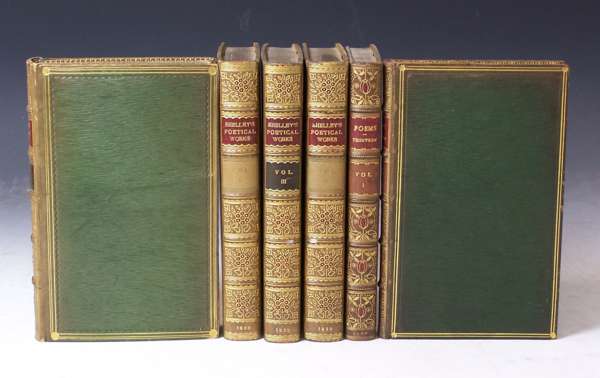 The poetical works of... London: Edward Moxon, 1839. 12mo, 4 volumes, edited by Mary Shelley, half titles, portrait frontispiece in volume one, 19th century grained green calf gilt, red and black labels, original cloth bound in, volume labels lacking from volumes II and IV, interiors clean; Tennyson, Alfred Poems. London: Edward Moxon, 1842. 12mo, 2 volumes, half titles, 19th century grained green calf gilt, interiors clean (6)