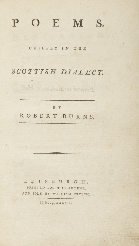 Poems, chiefly in the Scottish dialect. Edinburgh: for the author, 1787. Second [First Edinburgh] edition, 8vo, half-title, first issue with "skinking" on p. 263 and "Boxburgh" for "Roxburgh" in list of subscribers, engraved frontispiece, list of subscribers, nineteenth century half calf, lower margins dampstained, binding worn