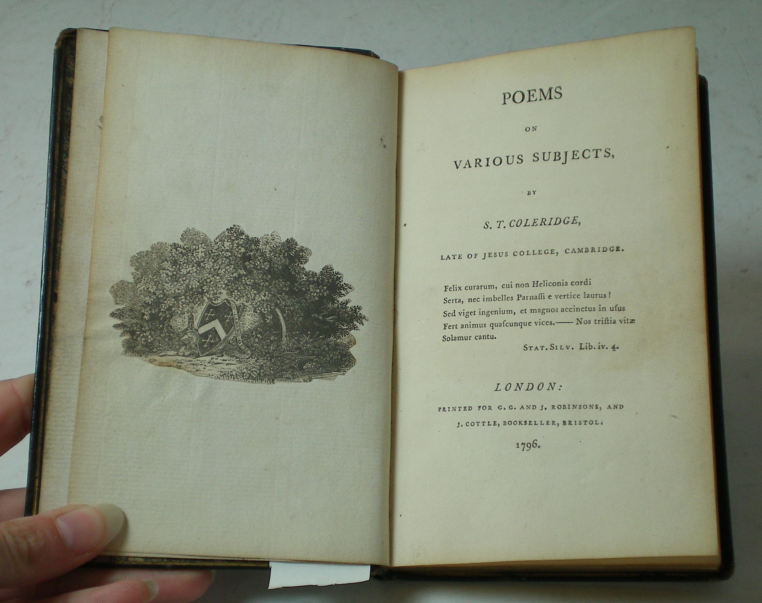 Poems on various subjects. London: printed for G.G. and J. Robinsons, and J. Cottle, Bookseller, Bristol, 1796. First edition, 8vo, lacking half title but with the errata and advertisement leaf, contemporary blue morocco gilt, marble endpapers, a.e.g., hinges cracking, bookplates