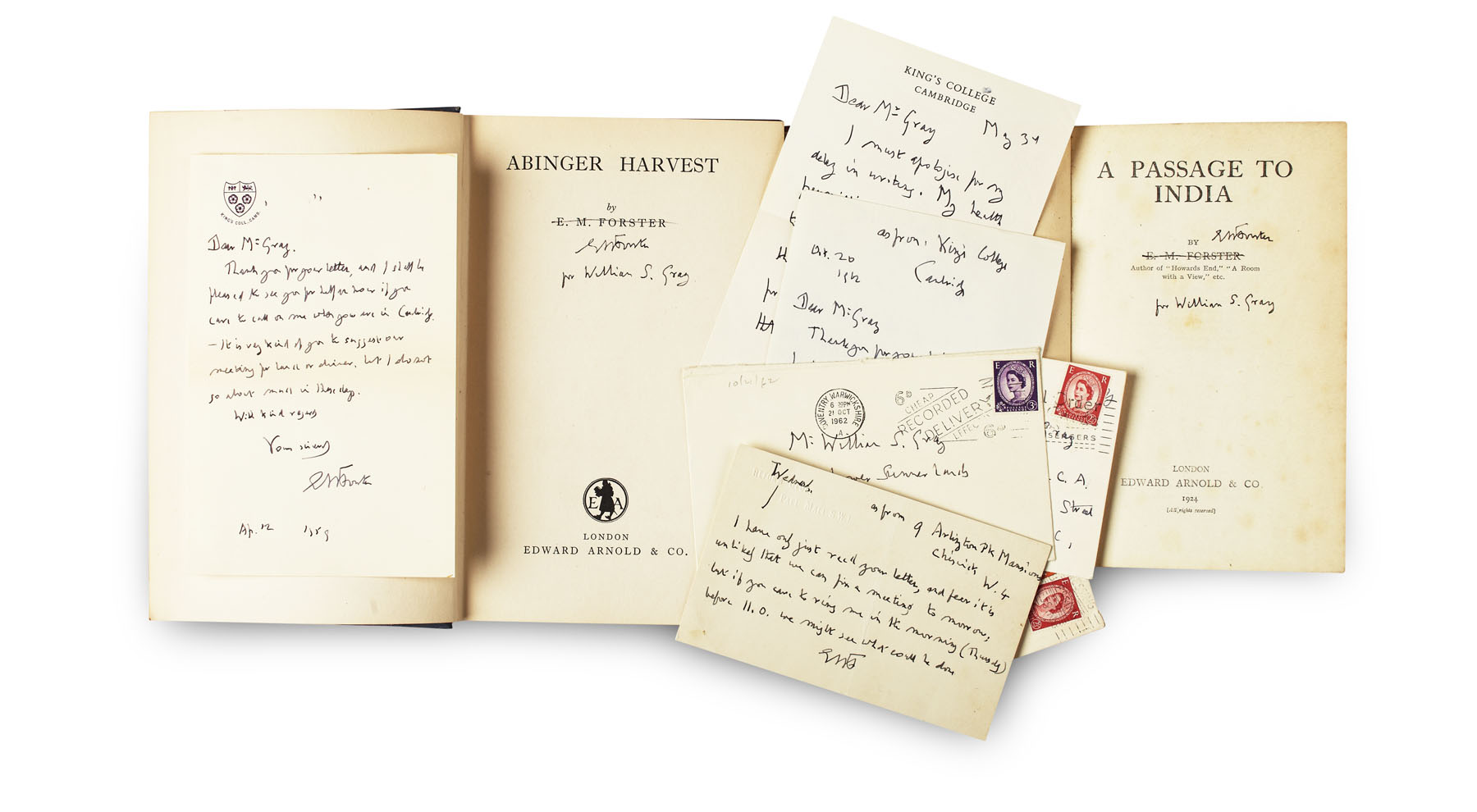 Three works, the second and third presentation copies inscribed to William ("Woods") Gray: Howard's End. 1910, fourth impression; A passage to India. 1924; Abinger Harvest. 1924; the last two first editions, original cloth, some foxing and some wear to cloth; together with 5 autograph letters signed by him, to William Gray, discussing arrangements to meet in London or Cambridge, King's College, 8vo, 1959-63, with 4 autograph envelopes.