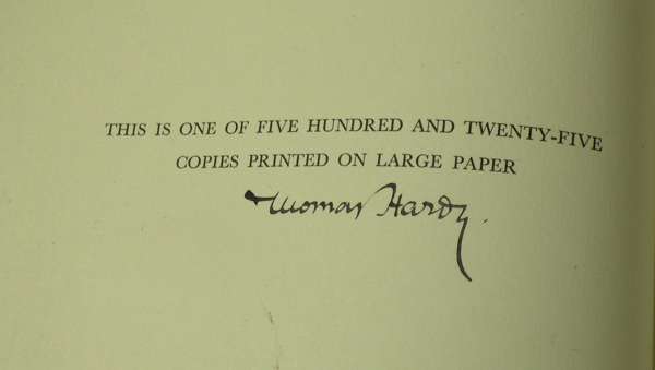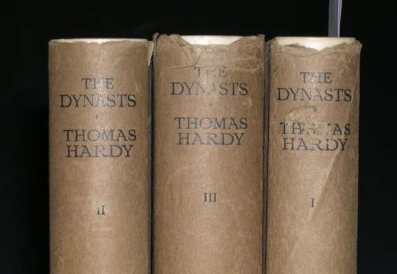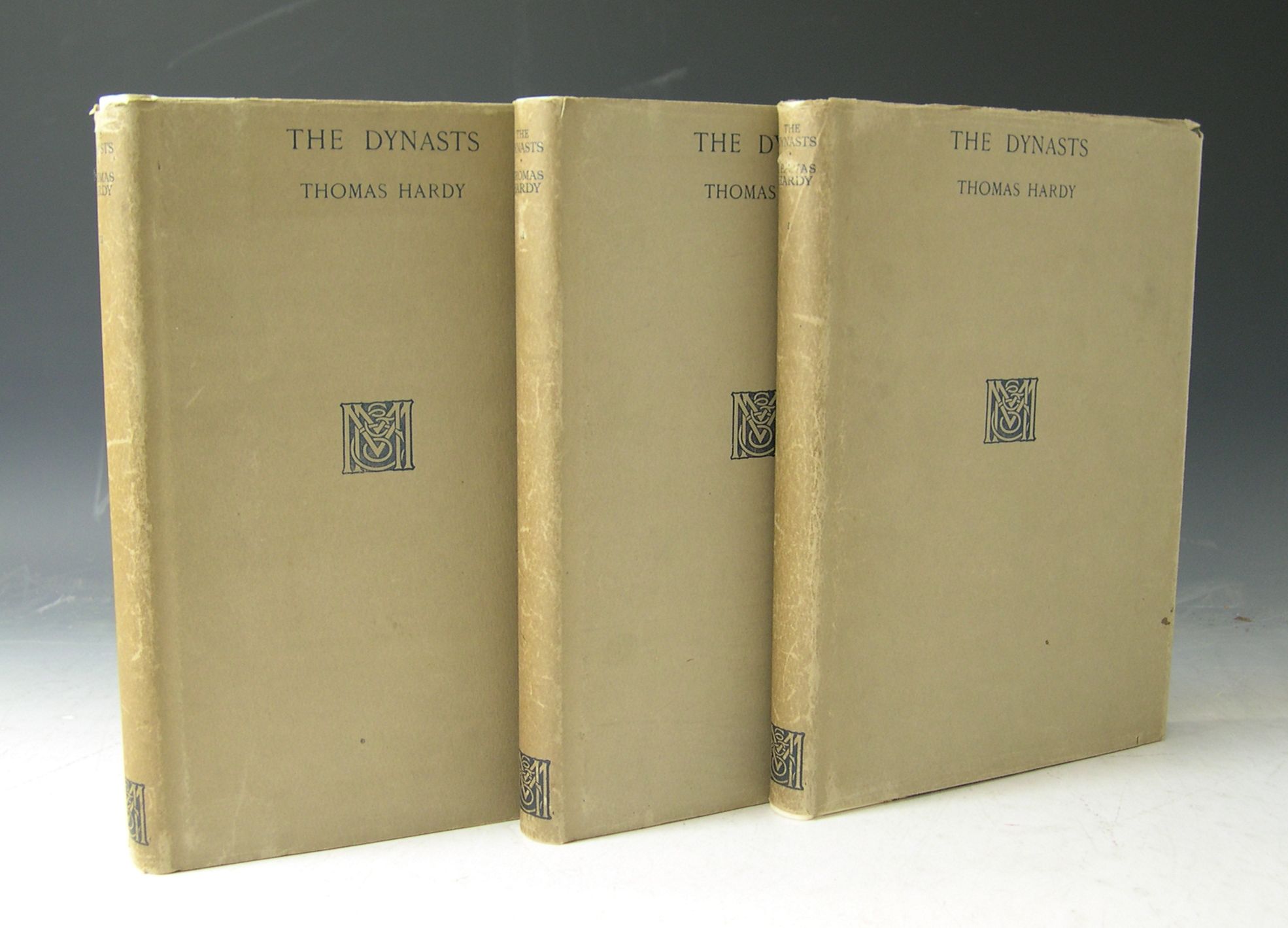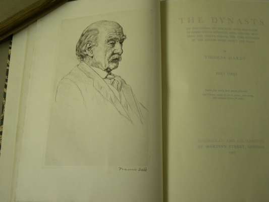 The dynasts, a drama of the Napoleonic war. London: Macmillan, 1927. 3 volumes, 4to, limited to 525 copies on large paper signed by the author, signed etched frontispiece portrait by Francis Dodd, original vellum-backed boards, uncut, dust-jackets slightly rubbed