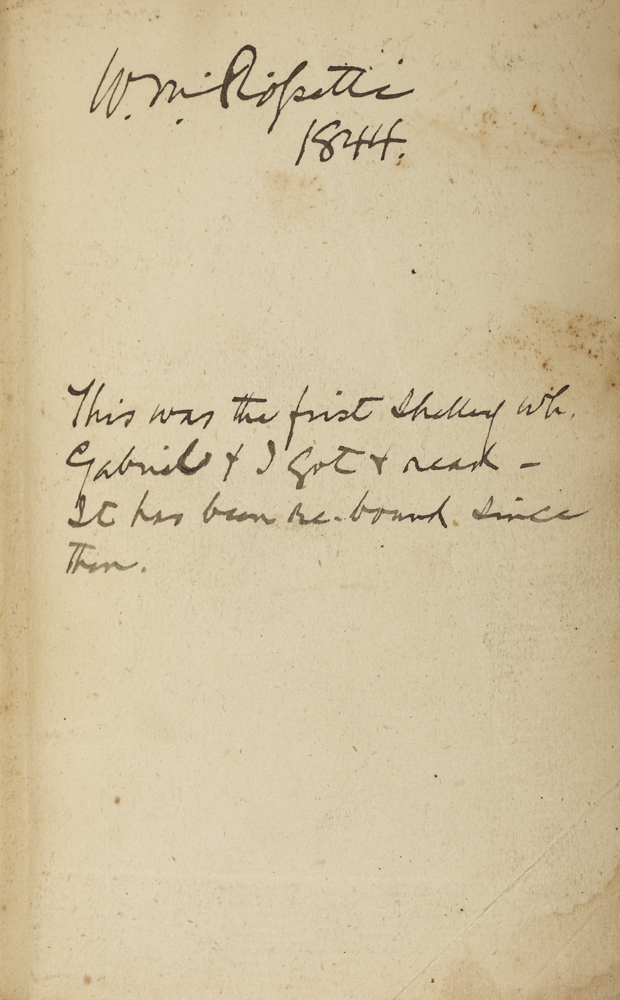 This volume was purchased by Dante Gabriel Rossetti, much against his mother's wishes - who considered Shelley's poetry to be quite indecent. In spite of the troubles Gabriel bought the volume and, according to his brother, "surged through its pages like a flame." (Doughty)