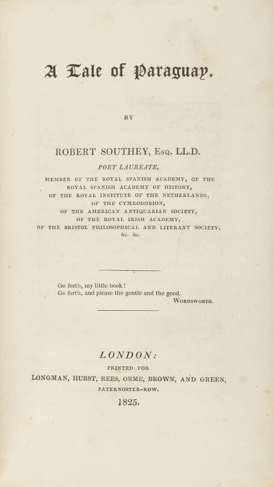 A tale of Paraguay. London: Longman, et al, 1825. First edition, 8vo, frontispiece, uncut, bound in decorative cloth by Mrs. Caroline Southey, bookplate, loosely inserted engraving of the view from the author's study, some foxing to frontispiece