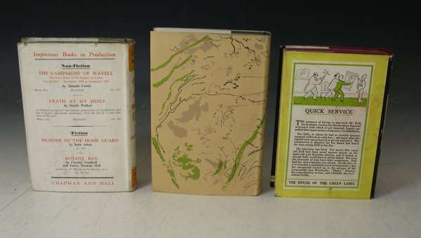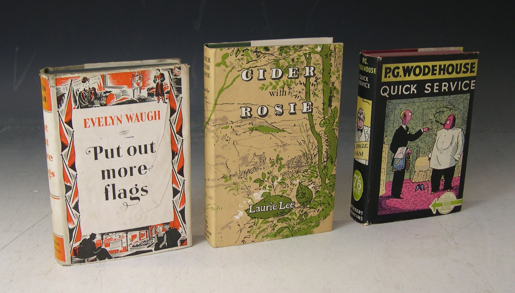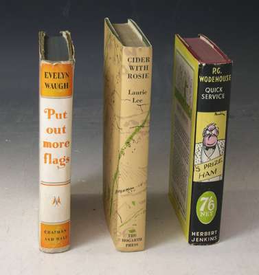 Put out more flags. London: Chapman & Hall, 1942. First edition, 8vo, original cloth, dustwrapper, chipped at edges, bookplate; Lee, Laurie Cider with Rosie. London: Hogarth Press, 1959. First edition, 8vo, illustrated by John Ward, original cloth, dustwrapper, a fine copy; Wodehouse, P.G. Quick service. London: Herbert Jenkins, 1940. First edition, 8vo, original cloth, dustwrapper, previous ink inscription to front endpaper (3)