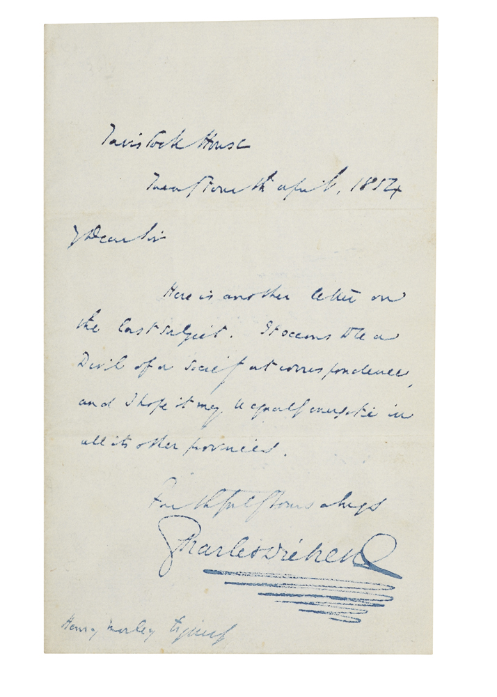 Autograph letter signed, to Henry Morley "Here is another letter on the last subject. It seems to be a Devil of a Society at correspondence, and I hope it may be equally energetic in all its other provinces..." Tavistock House, 24th April 1854, one page