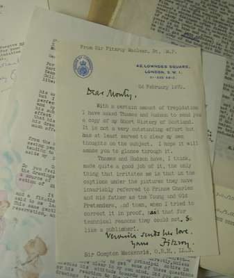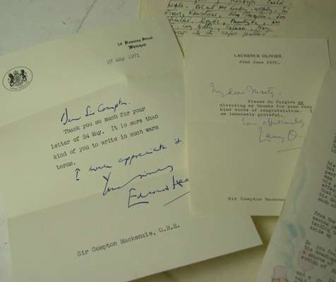 An archive of manuscript and typescript material relating to the work of Sir Compton Mackenzie, including various typescript drafts of the author's works and articles; personal letters to Mackenzie from a wide range of people from Edward Heath to Sir Fitzroy Maclean; typescript articles for news columns; a range of BBC scripts for radio; unpublished manuscript for Gestetner's; four volumes of corrected typescript for Octave 7 [autobiography]; original manuscript for Paper lives 1966; original manuscript for a film version of Monarch of the glen; BBC script and adaptation notes for a radio version of Whisky galore 1957; and a quantity of other material
