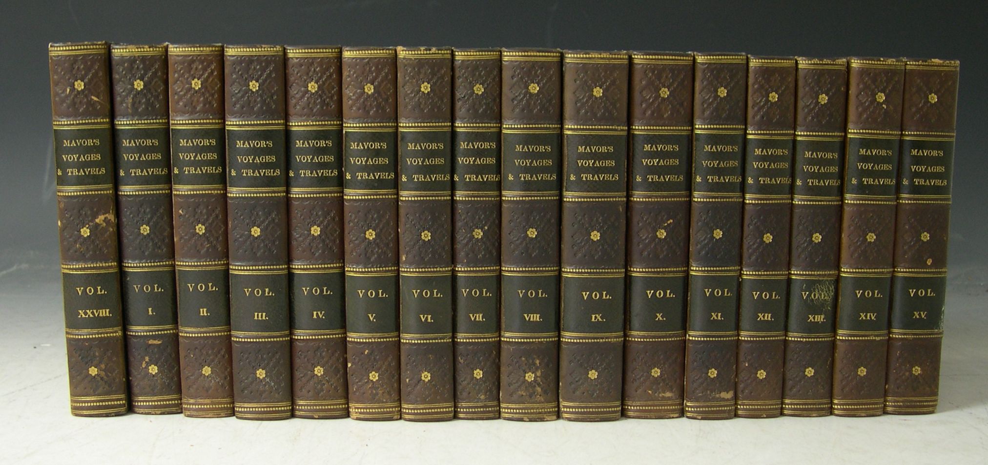 A general collection of voyages and travels. London: R. Phillips, 1810. 28 volumes, 12mo, folding maps, engraved plates, contemporary calf, spines gilt; [Idem] Universal history. London: Sherwood, Neely, 1812. 25 volumes, 12mo, contemporary calf, spines gilt; [Idem] The British tourist's or traveller's companion. London: R. Phillips, 1809. 6 volumes, 12mo, contemporary calf, spines gilt (59)