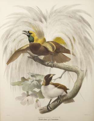 Great bird of paradise; Lesser bird of paradise, hand coloured lithographs, by J. Smit, from Elliot's A Monograph of the Paradisiedae, or Birds of Paradise, published 1873, D.G. Elliot, New York, the former with a small wormhole (?) in lower left corner of image, the latter the manuscript title slightly rubbed, 550-440mm., neatly inscribed with common names, laid down, framed and glazed (2)