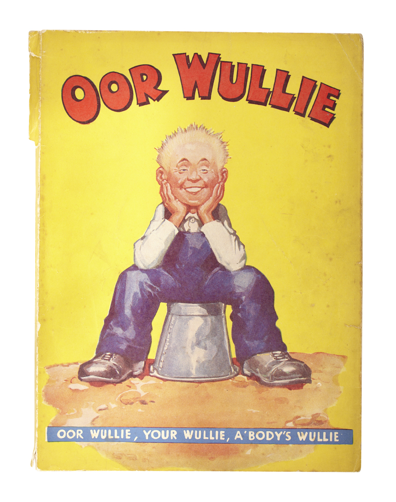 Oor Wullie Annual. London, Manchester & Dundee: D.C. Thomson & Co., [1940]. First annual produced, 4to, 96 pages, original printed wrappers showing Wullie sat on his trademark bucket, lower hinge torn at head, upper section of backstrip becoming loose, some creasing and short tear to outer edges, a few spots to page edges