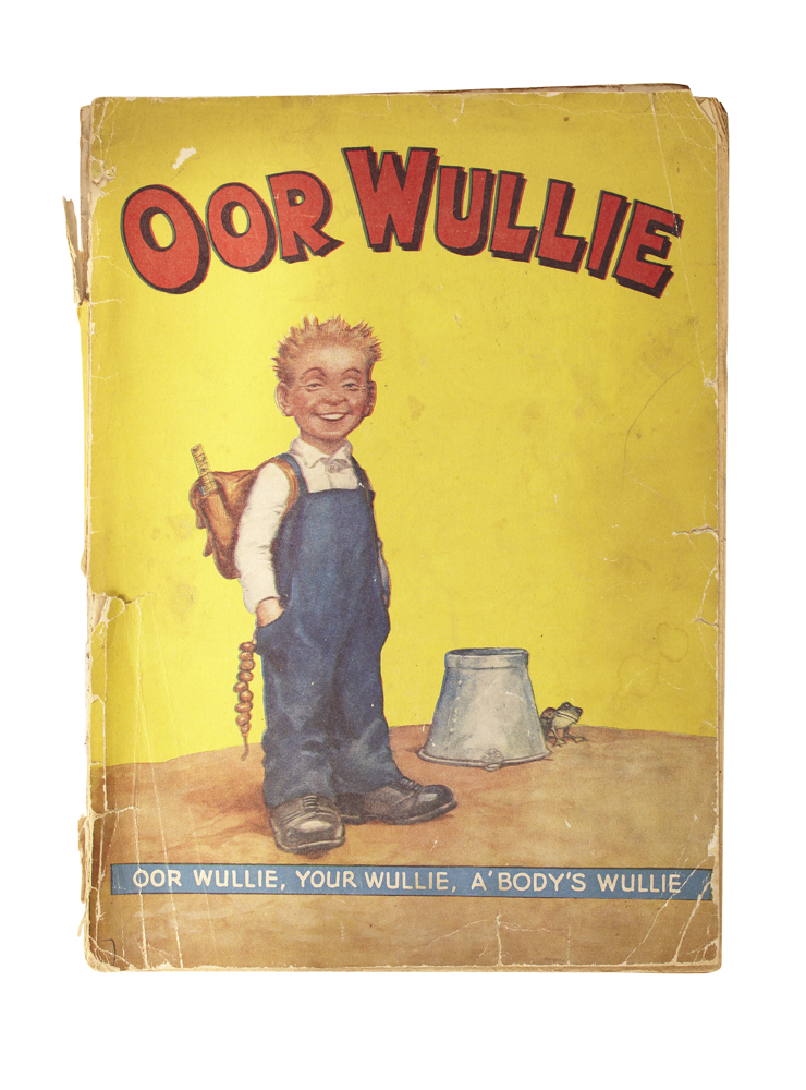 Oor Wullie Annual. London, Manchester & Dundee: D.C. Thomson & Co., [1942]. Second annual produced, 4to, 96 pages, original printed wrappers showing Wullie by his bucket, most of backstrip lacking, upper cover loose, creasing and tearing at edges, some browning to page edges, a little foxing to title