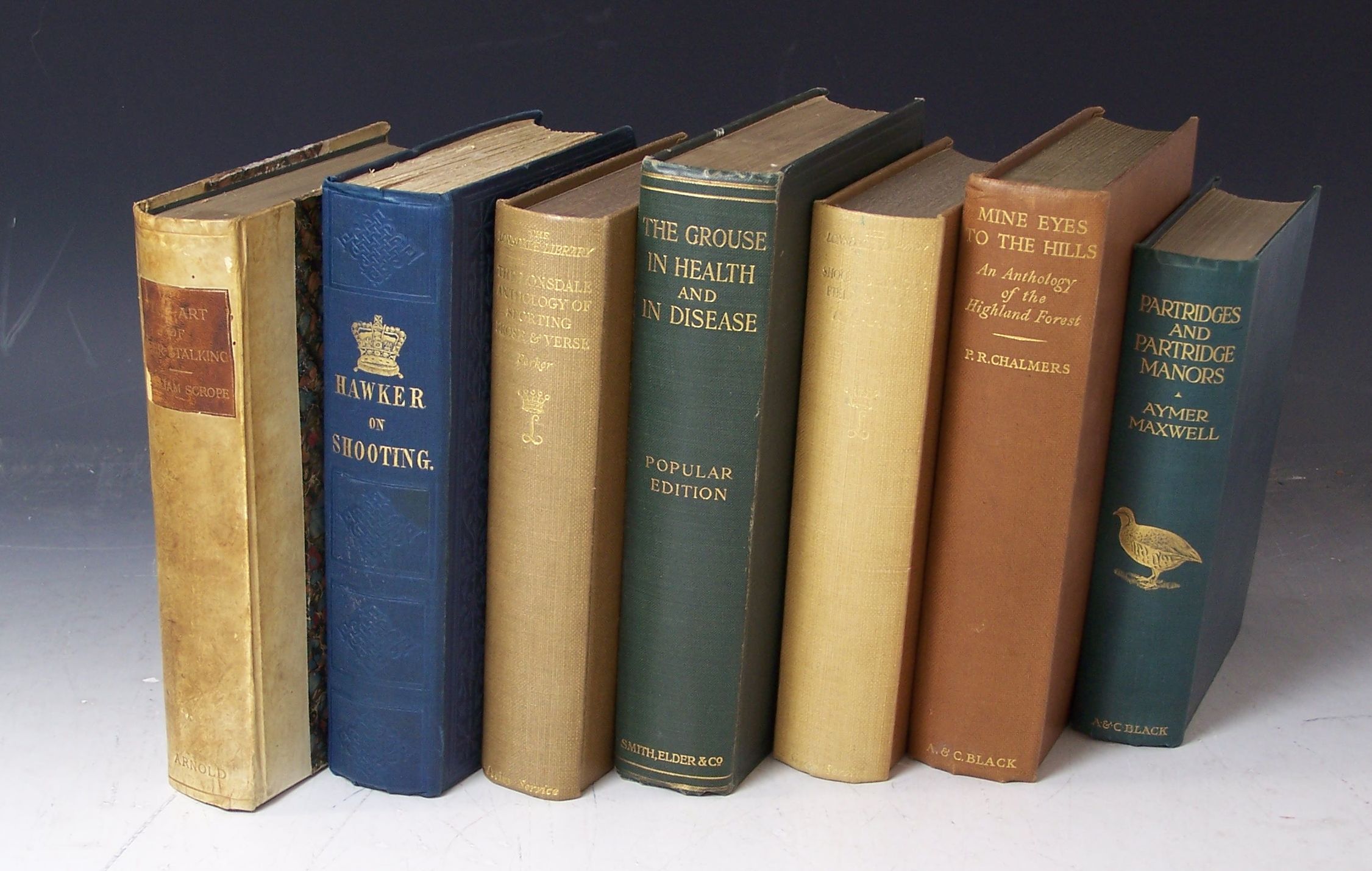 The art of deer-stalking. London, 1897. New edition, 8vo, plates, frontispiece, contemporary vellum, rubbed, foxing, bookplates, Hawker, Lt. Col. Instructions to young sportsmen in all that relates to guns and shooting. London, 1844. Ninth edition, 8vo, frontispiece, contemporary cloth gilt, contemporary ink inscription on title; Parker, Eric The Lonsdale anthology of sporting prose and verse. London, 1932. 8vo, plates, original cloth gilt; [Idem] Shooting by moor, field and shore. London, [no date]. 8vo, plates, original cloth gilt; Chalmers, Patrick Mine eyes to the hills. London, 1931. 8vo, illustrated by V.R. Balfour-Browne, frontispiece, original cloth gilt; Maxwell, Captain Aymer Partridges and partridge manners. London, 1911. 8vo, frontispiece, illustrated by George Rankin, original cloth gilt; Leslie, A.S. The grouse in health and disease. London, 1912. Popular edition, 8vo, frontispiece, plates, original cloth gilt; and 18 others (25)