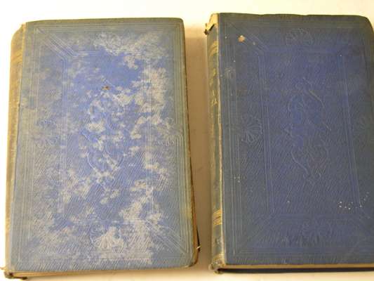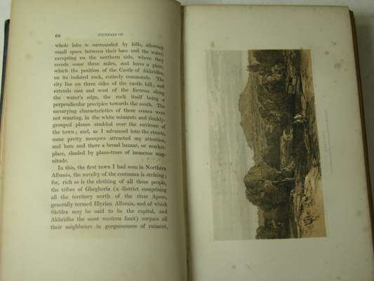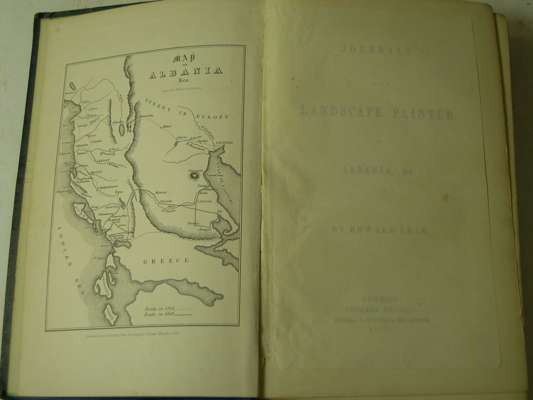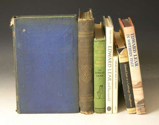 Journals of a landscape painter in Albania, etc. London: Richard Bentley, 1851. 8vo, map frontispiece, 20 lithograph plates, original blue blindstamped cloth gilt, torn at head of backstrip, foxing to plates, bookplates, newspaper cutting taped to front free endpaper; [Idem] Journals of a landscape painter in Southern Calabria. London: Richard Bentley, 1852. 8vo, frontispiece map [loose], 1 map, 20 lithograph plates, original blue blindstamped cloth gilt, boards faded and foxed, pages loose throughout the volume, inner hinges weak, bookplate; and 5 others on Lear (7)