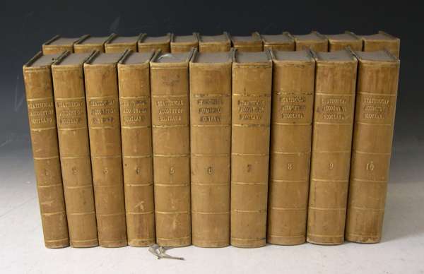 The statistical account of Scotland. Edinburgh: W. Creech, 1791-96. First edition, 21 volumes, 8vo, engraved plates, contemporary half calf, spines gilt, occasional light spotting, stamp to title of volume 17