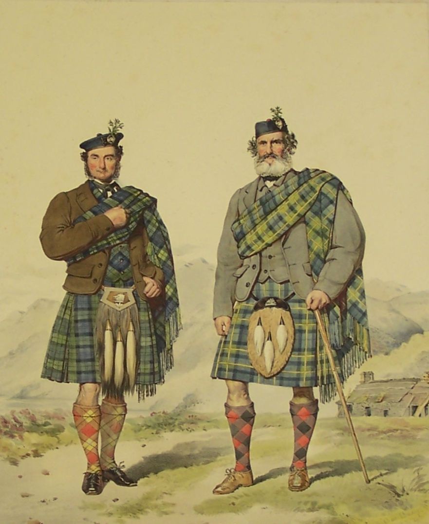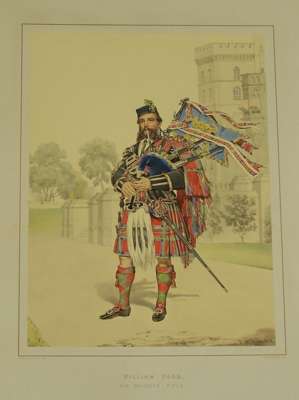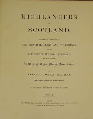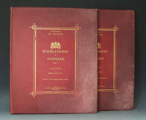 Highlanders of Scotland. Portraits illustrative of the principal clans and followings, and the retainers of the royal household at Balmoral. London & Edinburgh, 1870. Folio, 2 volumes, 31 colour plates [mounted on card leaves], original red cloth gilt, some foxing to occasional plates, water staining to boards, worn at corners; and 26 duplicate loose plates, majority foxed