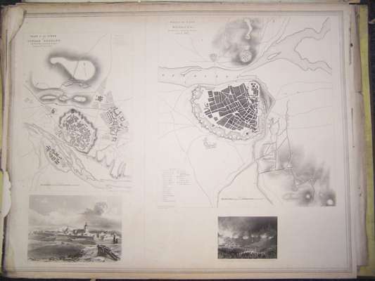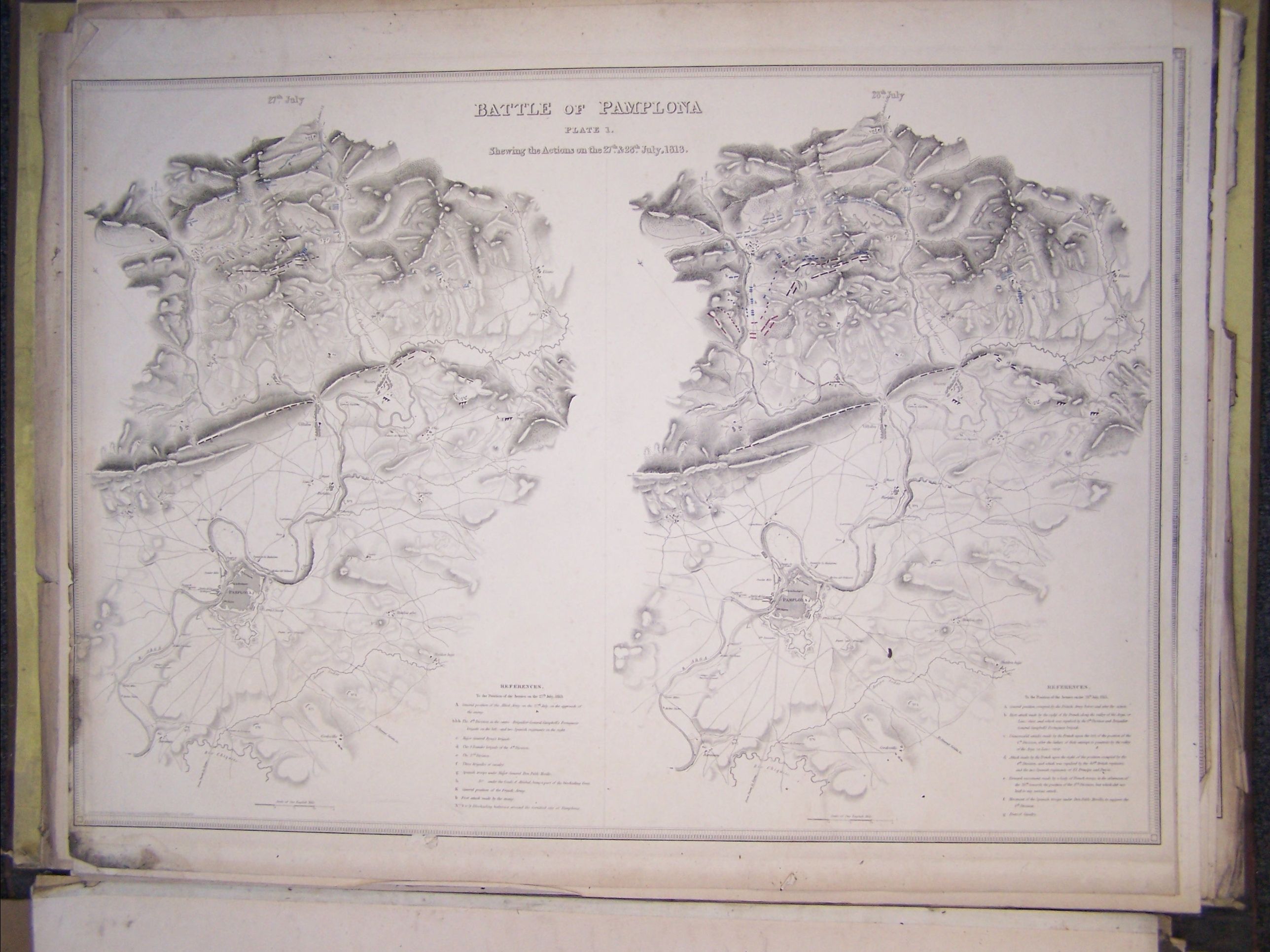 Maps & plans, showing the principal movements, battles & sieges, in which the British army was engaged during the war from 1808 to 1814 in the Spanish peninsula. London: J. Wyld, 1841. Folio, 35 (of 36) maps and plates, some double page, original morocco-backed cloth lettered in gilt, all but 8 with rodent damage, one completely defective; sold not subject to return
