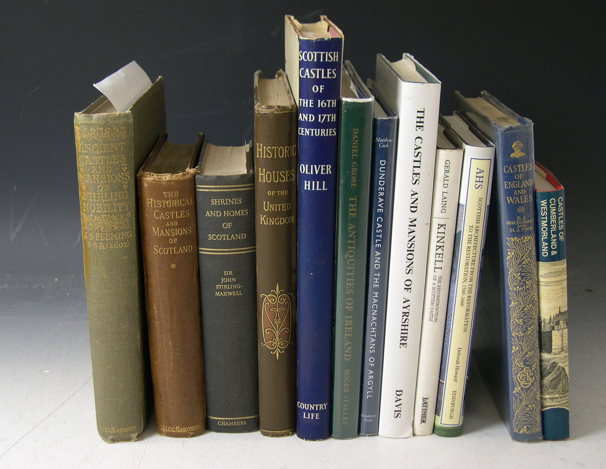 Ancient castles and mansions of Stirling nobility. Paisley and London, 1902. 8vo, frontispiece, original cloth gilt, previous ink inscription to front endpaper; Millar, A.H. The historical castles and mansions of Scotland. Paisley, 1890. 8vo, frontispiece, original cloth gilt; Stirling Maxwell, Sir John Shrines and homes of Scotland. London, 1957. 8vo, frontispiece, plates, original cloth gilt; Historic Houses of the United Kingdom. London, 1892. 4to, frontispiece, plates, original cloth gilt; Hill, Oliver Scottish castles of the sixteenth and seventeenth centuries. London, 1953. 4to, frontispiece, plates, original cloth, dustwrapper, previous ink inscription on front endpaper, and another copy in browned wrapper; Grose, Daniel The antiquities of Ireland. Dublin, 1991. Square 4to, original cloth, dustwrapper; Cock, Matthew Dunderave Castle and the MacNachtans of Argyll. California, 1998. 4to, original cloth, dustwrapper; Davis, Michael The castles and mansions of Ayrshire. Argyll, 1991. 4to, number 95 of 500 copies, signed by the author, original cloth, dustwrapper; Laing, Gerald Kinkell. London, 1974. 8vo, original cloth, dustwrapper; Howard, Deborah The architectural history of Scotland. Edinburgh, 1995. 8vo, original cloth, dustwrapper; Macdonald, E.J. & Finn, H.J. Castles of England and Wales. New York, [no date]. 8vo, original cloth, some foxing; Hugill, R. Castles of Cumberland and Westmorland. 8vo, original cloth, dustwrapper; and 58 others, mainly modern (71)