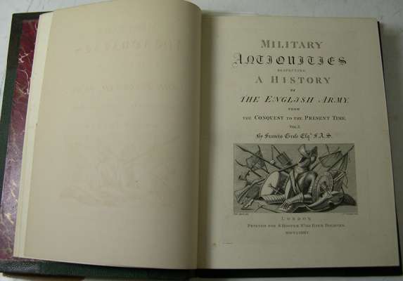 Military antiquities respecting a history of the English Army from the conquest to the present time. London: printed for S. Hooper, 1786. 4to, 2 volumes, engraved titles, 77 plates, later half morocco gilt, marble endpapers, bookplates; [Idem] A treatise on ancient armour and weapons. London: printed for S. Hooper, 1786. 4to, engraved title, 58 plates, later half morocco gilt [uniform with previous], bookplate (3)
