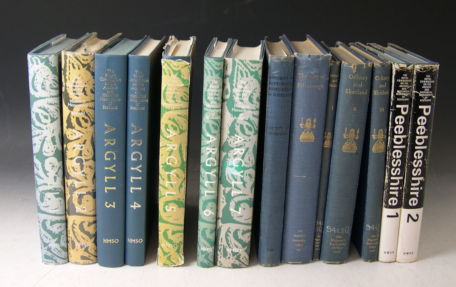 A collection of RCAMS volumes. Edinburgh, 1911-1992. 8vo & 4to, 29 volumes, including Caithness [1911, original wrappers in later cloth], Sutherland [1911, original wrappers in later cloth], Galloway [1912, 2 volumes, original wrappers in later cloth], Berwick [1915, later cloth, ex-library], Dumfries [1920, original blue cloth], East Lothian [1924, original blue cloth], Midlothian and Westlothian [1929, original blue cloth], Fife & Kinross [1933, original blue cloth], Orkney & Shetland [1946, 3 volumes, original blue cloth, ex-library], Edinburgh [1951, original blue cloth], Roxburgh [1956, 2 volumes, original blue cloth], Selkirk [1957, dustwrapper], Stirlingshire [1963, 2 volumes, original blue cloth], Peebleshire [1967, 2 volumes, dustwrapper], Argyll [1971-92, 7 volumes, vols 1-2, 5-7 in dustwrappers], Lanarkshire [1978, original blue cloth]; and 5 printed aerial photography lists (34)
