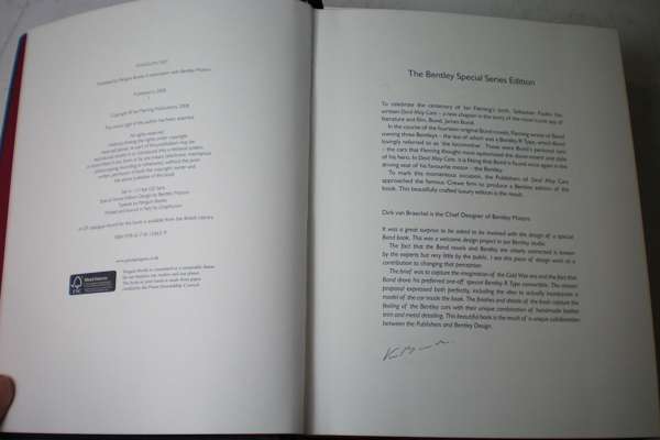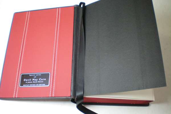 Devil may care. Bentley Motors Ltd. Edition, 2008. First edition, Special series, no. 117, "Burnt Oak" leather, with diamond pattern red stitching with Bentley "Flying B" radiator cap symbol on front cover and spine, red leather endpapers, with cast and polished 1:43 scale model of the R-type Bentley inset into the text, in plexiglass slipcase
