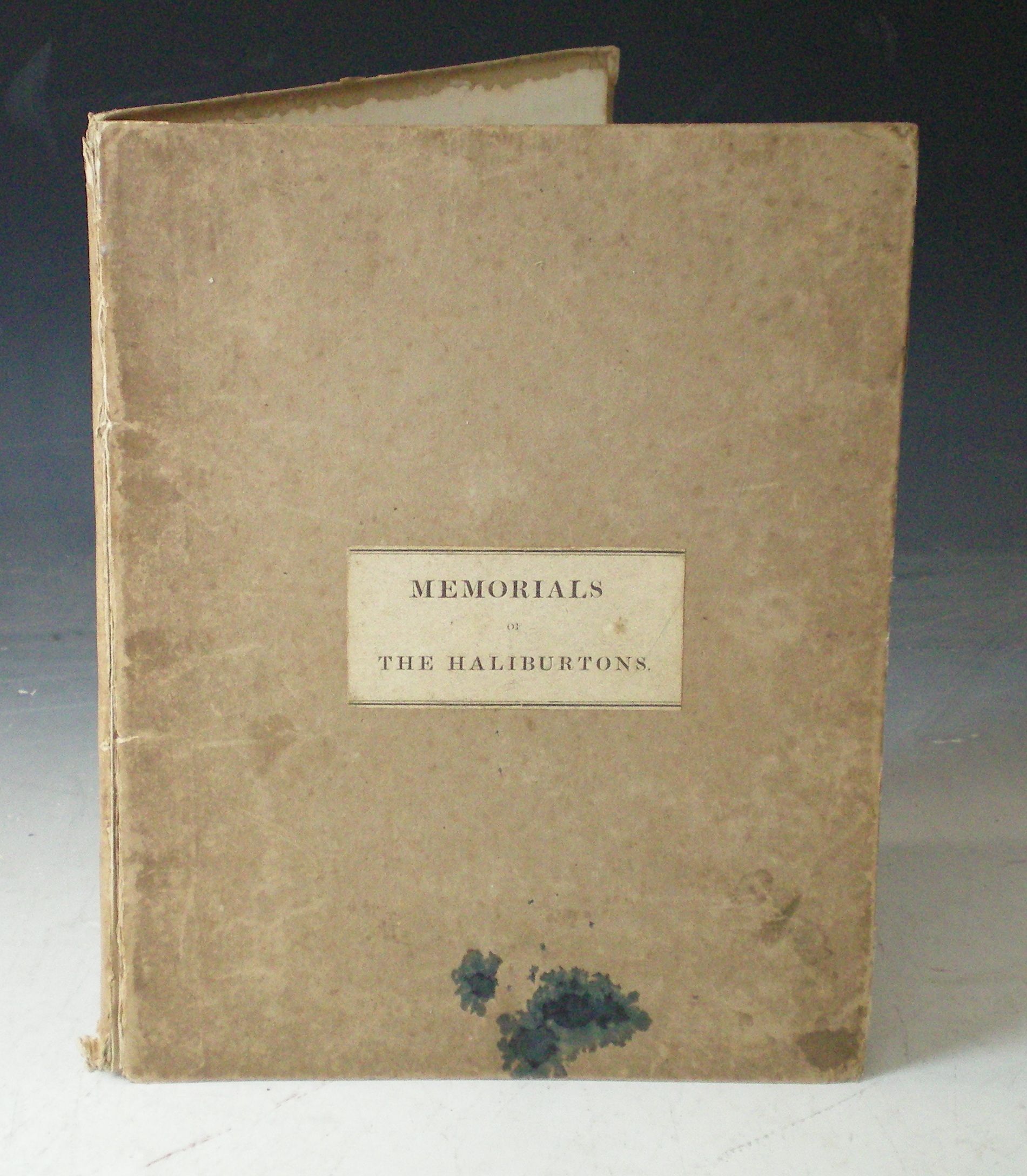 Memorials of the Haliburtons. Edinburgh: J. Ballantyne & Co., 1820. First edition, 4to, presentation copy to "Charles Erskine Esq. of Sheffield, representative of the ancient family of one mentioned in these memorials from his affectionate Walter Scott", engraved frontispiece, original boards, bookplate of Charles Erskine, frontispiece spotted and offset onto title, extremities and spine worn, upper boards detached, ink stain to upper cover