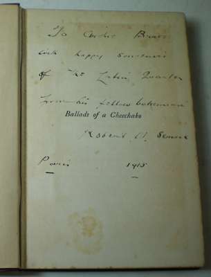 A collection of presentation copies from Service to Archibald K. Bruce, to include Ballads of a Cheechako. London, 1914. Fourth impression, 8vo, original cloth, some browning to early leaves, foxing; Rhymes of a rolling stone. London, 1913. Second impression, 8vo, original cloth gilt, some foxing; Songs of a sourdough. London, [no date]. Twenty-seventh impression, 8vo, original cloth gilt; Ballads of a bohemian. London, 1921. 8vo, original cloth gilt, backstrip faded; The rhymes of a red-cross man. London, 1916. 8vo, original red cloth gilt, some foxing, backstrip fading; The pretender. London, 1915. 8vo, original cloth gilt, faded, inner hinges weak, foxing; The house of fear. New York, 1927. First edition, 8vo, original decorative cloth, rubbed; The master of the microbe. New York, 1926. 8vo, original cloth, backstrip faded, some foxing; The poisoned paradise. New York, 1922. 8vo, original cloth , faded (9)