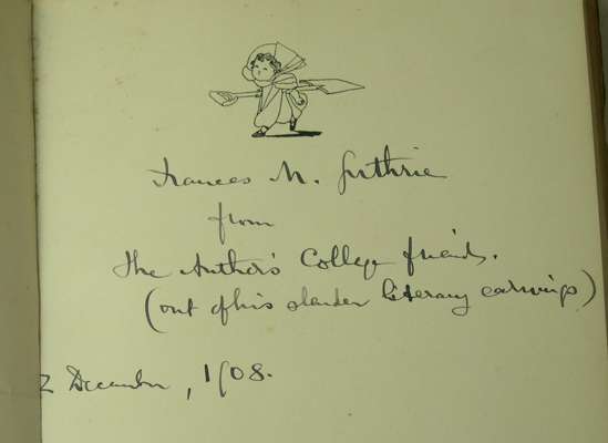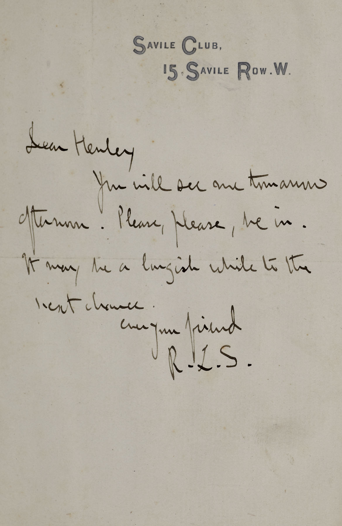 Autograph letter initialed to W.E. Henley "Dear Henley, you will see me tomorrow afternoon. Please, please, be in. It may be a longish while to the next chance. Ever your friend, R.L.S.", Savile Club headed paper, undated, glued to verso of front free endpaper; Cunningham, Alison [R.L.S. Stevenson's nanny] A.L.S. to the portrait painter George Fiddes Watt, saying that she is not able to sit for him due to a sore throat, 2 pp., 1 Conniston Place, 1 March 1909, tipped in; Fiddes Watt, GeorgeA.L.S. to Lord [Charles John] Guthrie, thanking him for the cheque of 50 guineas for the picture of Cummy [Alison Cunningham], stating that he cannot paint her today as she is not well and that he is enclosing her reply to him, with a signed receipt for the portrait of Cummy, 3pp., 2 Great Stuart Street, Edinburgh, 3rd March 1909, tipped in; Guthrie, Jane A.C. A.L.S. to Lord Guthrie, thanking him for a wonderful teddy bear for Euan, 18 March 1909, tipped in, all present in a copy of A child's garden of verses. London: John Lane, The Bodley Head, [?1908], illustrated by Charles Robinson, inscribed on first blank leaf by Lord Guthrie to "Frances M. Guthrie from the author's college friend (out of his slender literary earnings), 2 December 1908", 8 coloured plates, numerous illustrations & coloured endpapers by Charles Robinson, original pictorial cloth, t.e.g., others uncut, occasional slight spotting, short split at head of joints