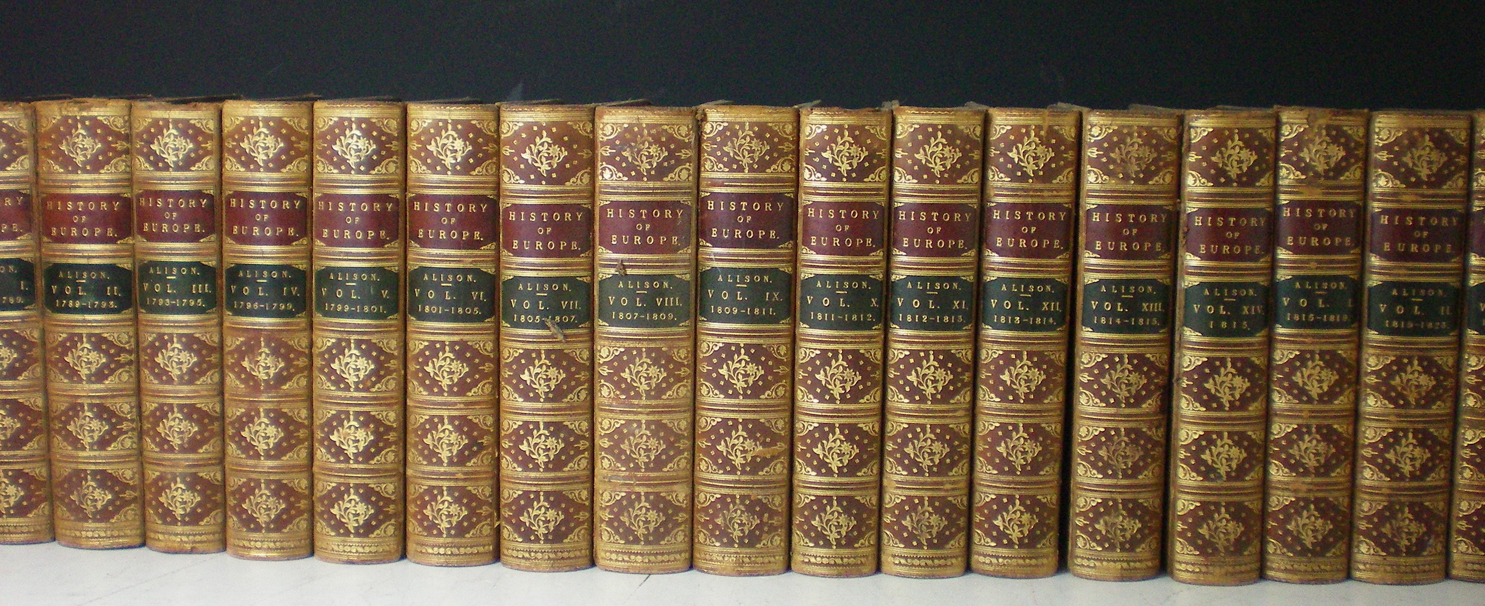 History of Europe. 1860-61. 24 volumes including atlas and index volume, contemporary calf, rubbed; Bewick, Thomas History of British birds. Newcastle: E. Walker for T. Bewick, 1799-1804. 2 volumes, 8vo, woodcuts, contemporary calf, worn, one volume rebacked, one volume worn, covers detached; Archer, T. The war in Egypt and the Soudan. 1886. 4 volumes, 8vo, original cloth gilt; Groome, F.H. Ordnance gazetteer of Scotland. 1884. 6 volumes, 8vo, plates, folding maps, original cloth gilt; Churchill, Sir W. The second world war. 1948-1954. First editions, 6 volumes, 8vo, dust-jackets; Dulac, Edmund Fairy book. [N.d.], 4to, 15 mounted coloured plates, original cloth; Ordnance Survey Index to the Ordnance Survey of Peebleshire. Undated, hand-coloured engraved map, dissected and backed on linen, folding into cloth covers; Gibbon, Edward The history of the decline and fall of the Roman Empire. London, 1817. 12 volumes, 8vo, contemporary calf, rebacked, some spotting; Clarendon, E. Hyde, Earl of The history of the rebellion and civil wars in England. Oxford, 1707. 3 volumes bound in 6, 8vo, engraved portraits, rebacked, boards somewhat wormed; Potter, Beatrix The tale of little pig Robinson. 1930, reprinted. 4to, coloured plates, dust-jacket (quantity); sold not subject to return
