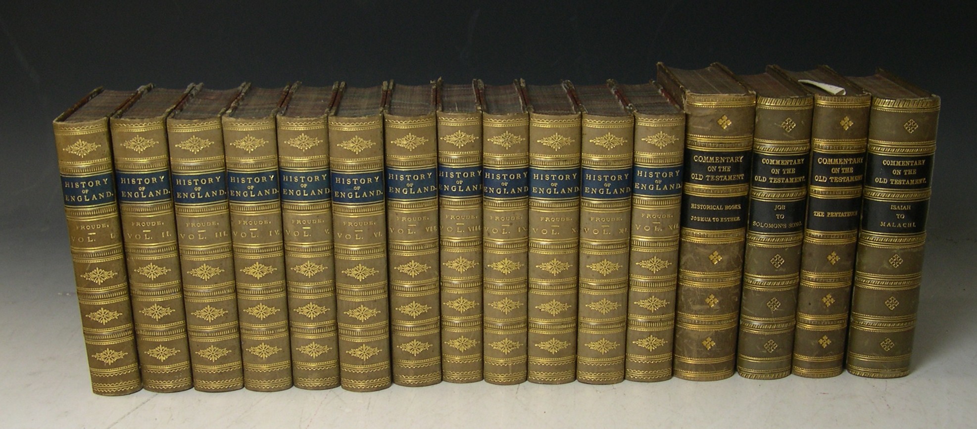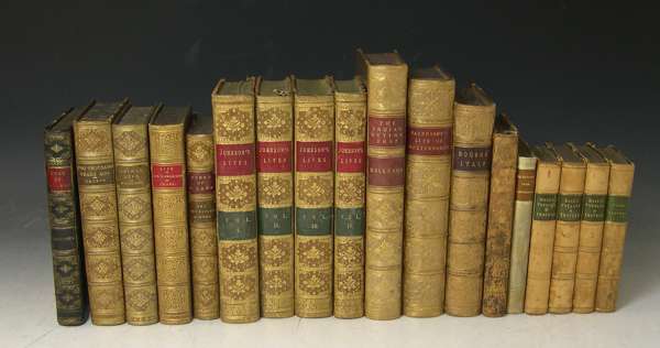 History of England. London, [no date]. 8vo, 12 volumes, contemporary half calf gilt, marble endpapers; Johnson, Samuel The lives of the most eminent English poets. London, 1781. 8vo, 4 volumes, portrait frontispiece, contemporary calf, rebacked, lacks title to volume 3, edges worn; Malleson, Colonel G.B. The Indian mutiny of 1857. London, 1891. 8vo, portrait frontispiece, contemporary tree calf gilt, red labels, inscription on front endpaper; S.P.C.K. Commentary on the Old Testament. London, 1889. 8vo, 4 volumes, contemporary calf gilt; Hall, Capt. Basil Fragments of voyages and travels. Edinburgh, 1832. Second edition, 8vo, 3 volumes, contemporary half calf, library stamps, backstrip rubbed; and 13 others, mainly 19th century calf (37)