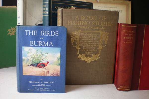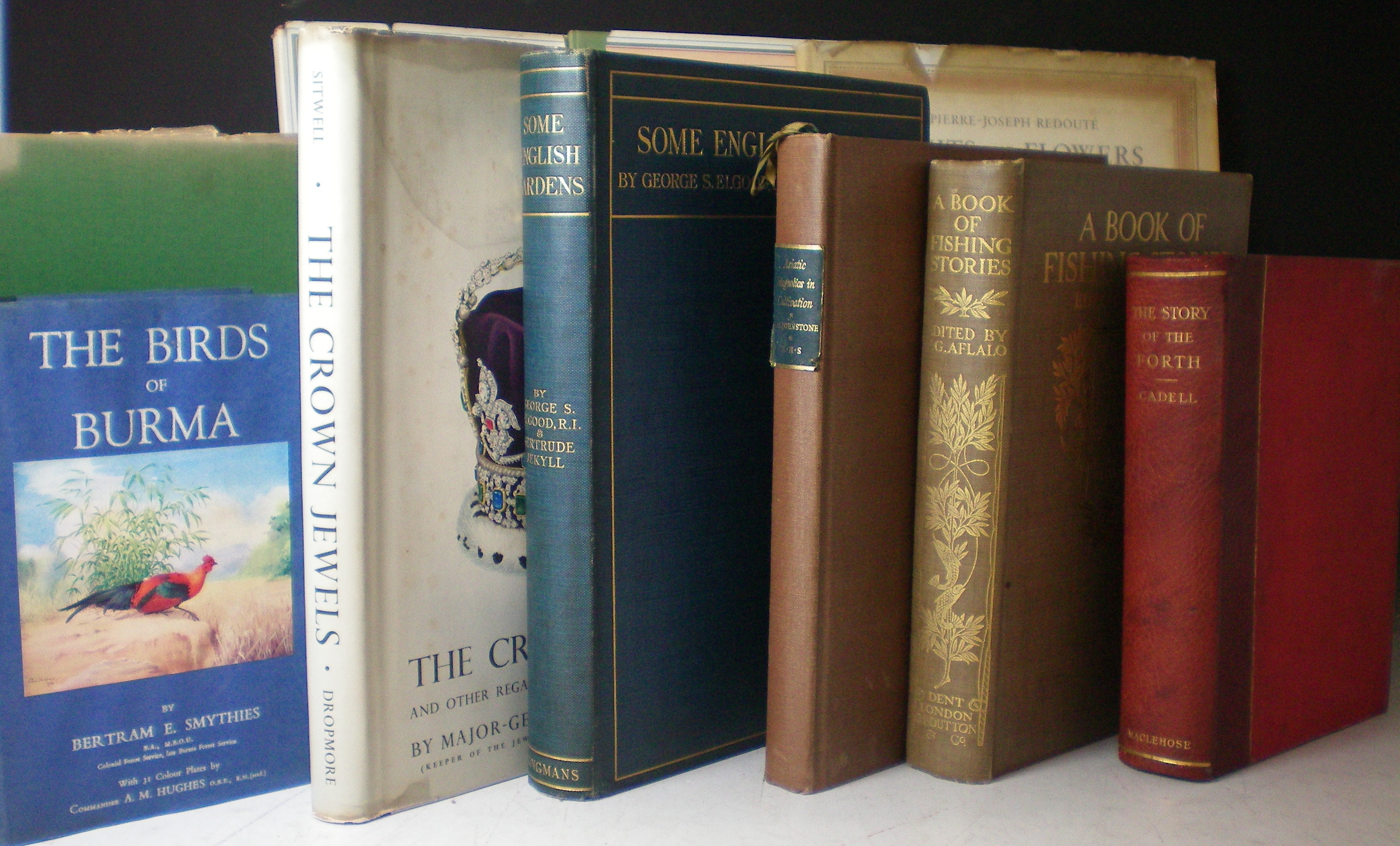The birds of Burma. 1953. 8vo, coloured plates, dust-jacket; Jekyll, G. Some English gardens. 1904. Folio, coloured plates, original buckram, t.e.g., slightly spotted; Cadell. H.M. The story of the Forth. Glasgow, 1913. 4to, limited to 60 copies on hand-made paper, plates, original red morocco-backed cloth, t.e.g., others uncut; Johnstone, G.H. Asiatic magnolias in cultivation. 1955. 4to, coloured plates, original buckram; Aflalo, F.G. A book of fishing stories. 1913. 4to, plates, original buckram gilt, t.e.g., others uncut; Urquhart, B.L. The rhododendron. Leslie Urquhart Press, 1958-62. 2 volumes, folio, coloured plates by Carlos Riefel, original cloth, dust-jackets; Redouté, P.J. Fruits and flowers. Ariel Press, 1955. Folio, coloured plates, original cloth, dust-jacket frayed; and 2 others (10)