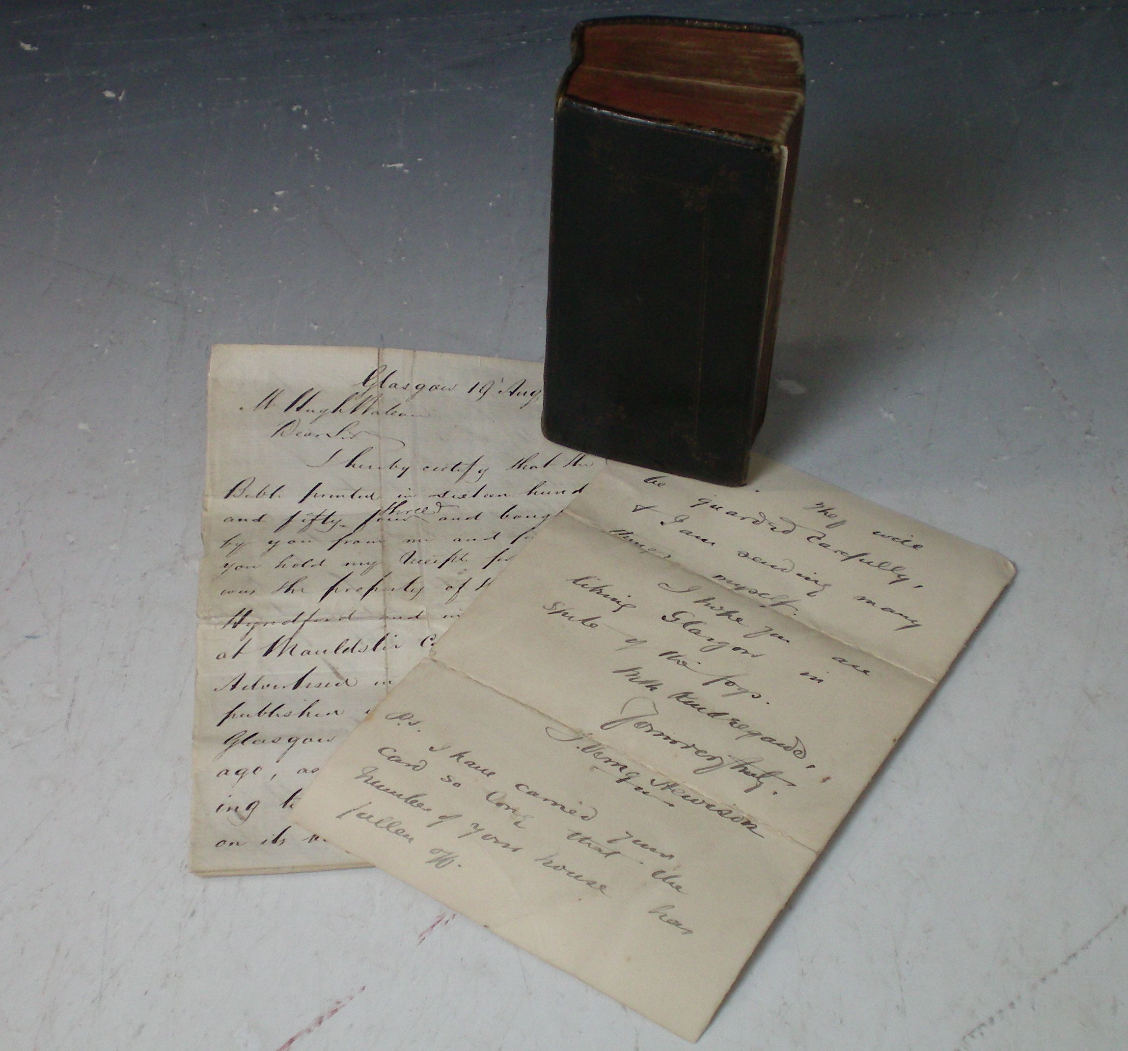 Together with a letter from J. V. Hewison thanking Mrs Dobbie for the loan of the Cromwell Bible to the Glasgow exhibition, 22 Nov. 1910.