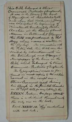 Note: With an early 20th century note "This Bible belonged to Oliver Cromwell, Protector of England. It was in the library of the Earl of Hyndford at Mauldslie Castle and when that nobleman's library was sold (about the beginnning of the 19th century) by public auction at the rooms of David Mann in Saltmarket Glasgow, this Bible was purchased by Thomas Hogg whose name is written on the fly-leaf. For connection with the Public Sale this Bible was described by advertisements in the Edinburgh and Glasgow newspapers of the time as the Bible which belonged to Oliver Cromwell, Protector of England. The typographical errors so frequent in most copies of this edition correct in this except one. Oliver Cromwell read during his speech in the Painted Chamber on 16th Sept. 1656 (a very hot day) the LXXXV Psalm. On page opposite there is a distinct thumb-mark, the only one in the book.