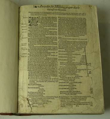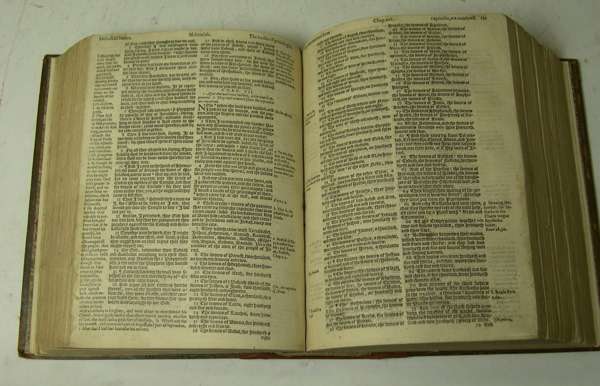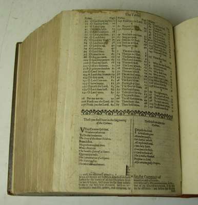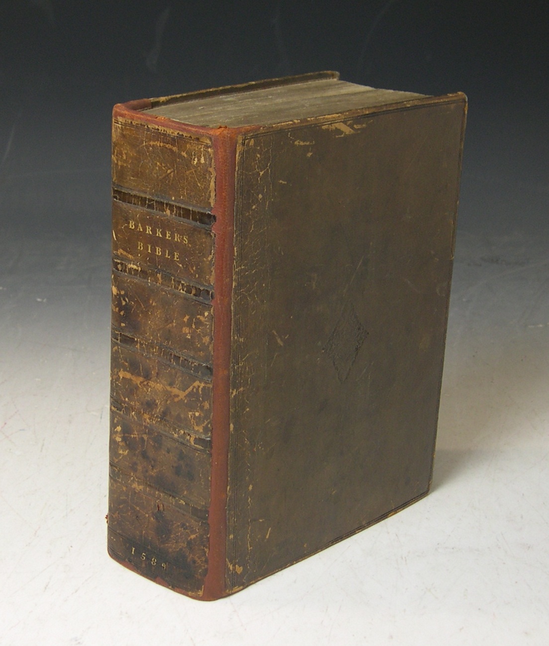 London: Deputies of Christopher Barker, 1589. 8vo, woodcut titles, strip torn from margin of general title with very slight loss of woodcut, cut close at head with some running titles shaved, L8 torn without loss, O2 with loss to lower blank margin, a few spots and stains, YY3 misbound, margins of HH1-8 and YY1-8 slightly frayed or cropped, slight loss to sidenote of SS4, some loss to text of VV5-VV7, ZZ6, lacking O.T. text after HH8; New Testament: lacking Matthew up to KKK8, lacking part of MMM1 and OOO8, lacking NNN1, [Darlow & Moule 199], Collects and Psalms lacking leaves, nineteenth century calf, neatly rebacked retaining original spine. Sold not subject to return