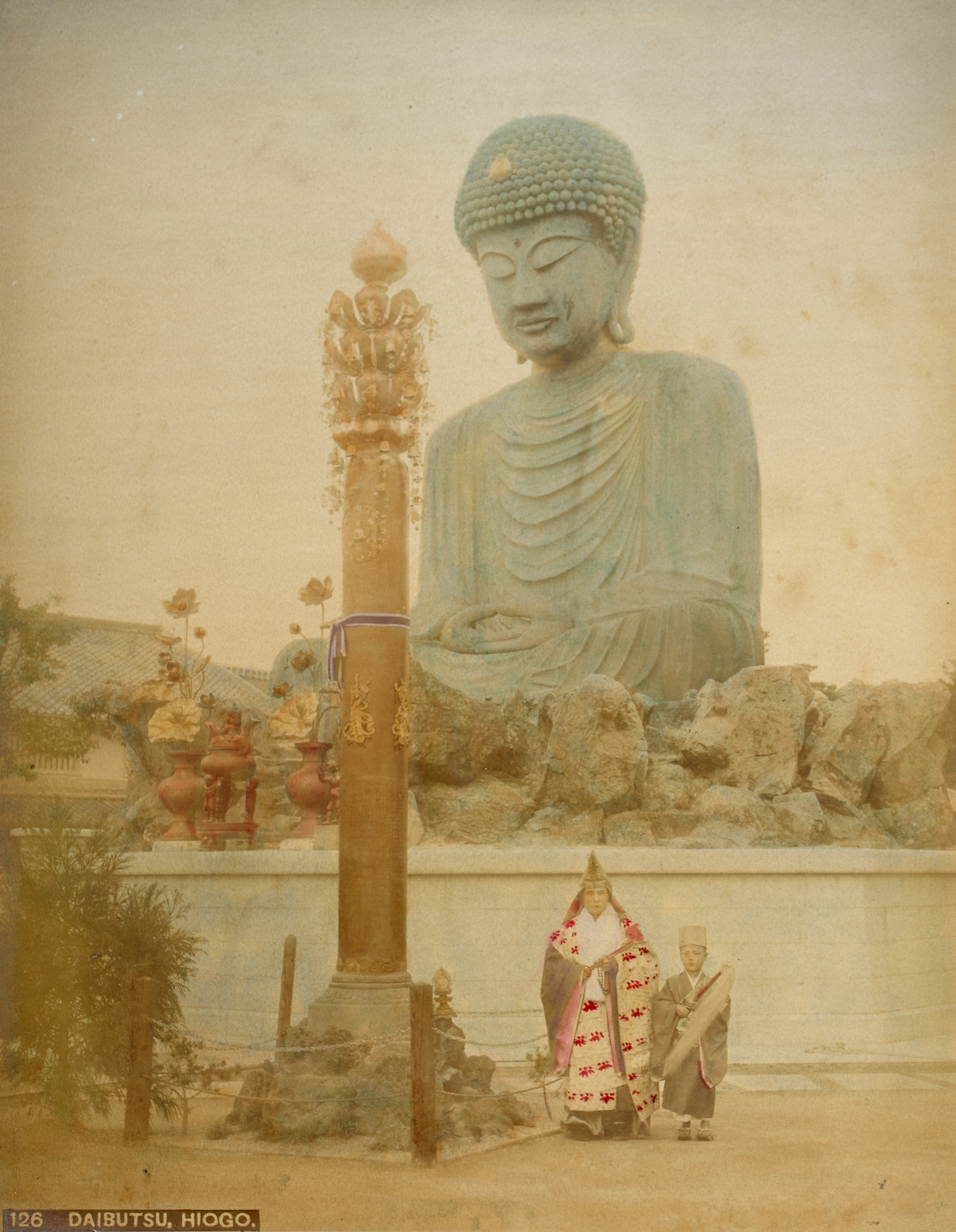 An album of 50 hand-tinted albumen prints, each approx. 20 by 27cm., captioned in negative, to include five views of Kobe, Daibutsu at Hiogo, Temple at Hyogo, Suma Beach, Takarazuka, view of Osaka, Temple at Nara, Fujiama from Otometoge, three view of Yokoama, there views of Toyko, Kagurado at Nikko, stone steps at Nikko, Matsushima, inland sea at Bingo, Takaboko at Nagaski, Wakamiya inari, picking tea leaves, farming, rice paddies, sedan chair, 12 prints of geisha girls [eating sushi, dancing, etc], shampooer, sumo wresters, young nurse, original lacquered album, all prints pasted onto card leaves, some foxing to tissue guards, lacking backstrip, rear board cracking