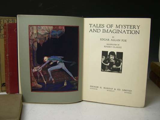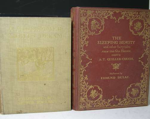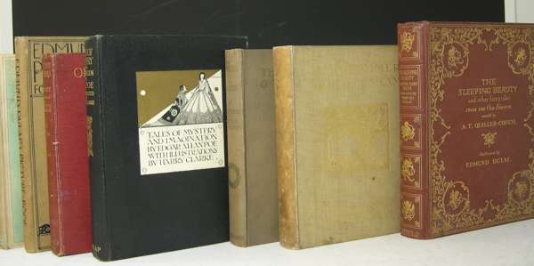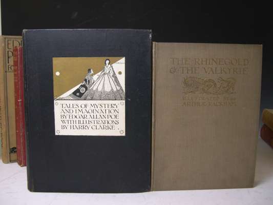 The sleeping beauty and other fairy tales. London: Hodder & Stoughton, [c. 1910]. 4to, 30 mounted coloured plates by Dulac, original brown cloth gilt; Housman, L. Princess Badoura. Hodder & Stoughton, [n.d.]. 4to, 10 mounted coloured plates by Dulac, original cloth slightly discoloured; Poe, E.A. Tales of mystery and imagination. 1923. 4to, 32 plates by Harry Clarke, original pictorial cloth gilt; Shakespeare, William A midsummer night's dream. W. Heinemann, 1908. 4to, 40 mounted coloured plates by Arthur Rackham, tissue guards, original pictorial cloth gilt, recased, binding slightly soiled; Wagner, Richard The Rhinegold & the Valkyrie. W. Heinemann, 1920. 4to, 34 coloured mounted plates, tissue guards, original pictorial cloth; Dulac, E. Edmund Dulac's picture book for the French Red Cross. [N.d.], 4to, 20 mounted plates, original cloth, binding lightly marked; and another [Old-time stories] (7)