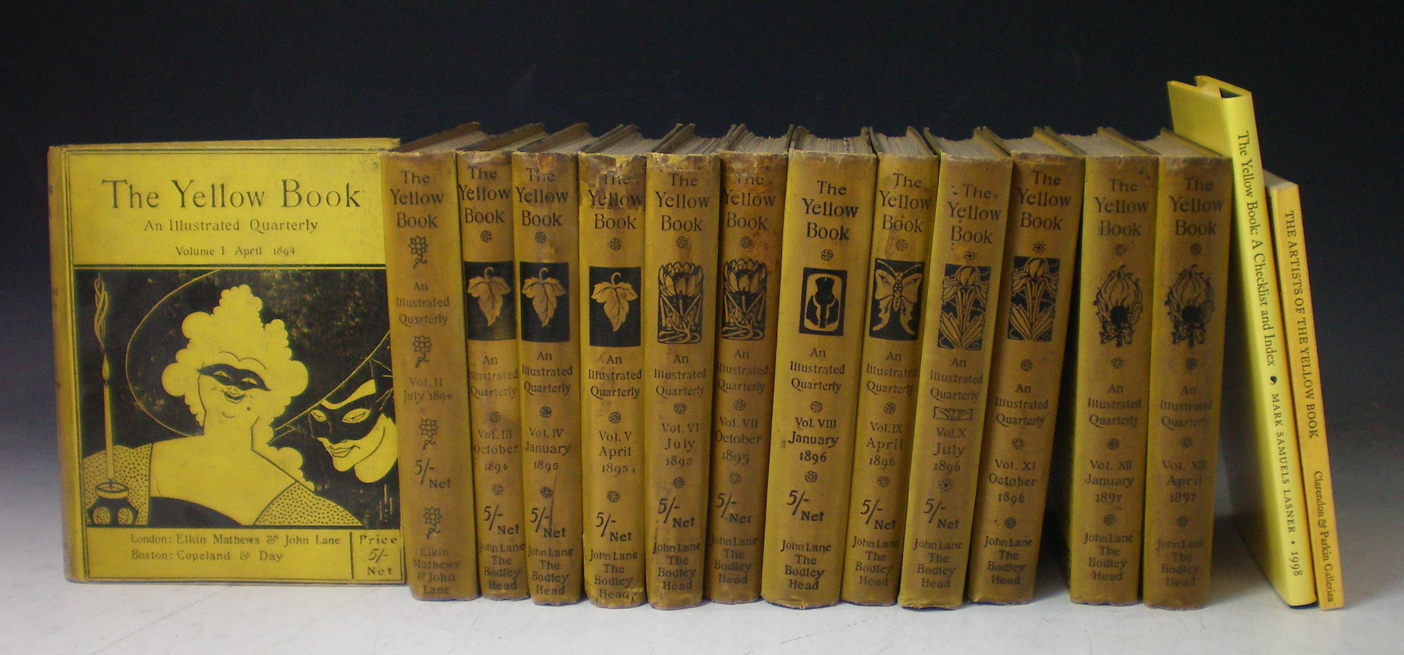 An illustrated quarterly. London: The Bodley Head, 1894-1897. 8vo, 13 volumes, cover deisgns by Aubrey Beardsley, Nellie Syrett, J.D. Mackenzie, et al, original yellow cloth, backstrips discoloured, chipped at headpieces, volume V previous tape marks to headpiece; and 2 others (15)