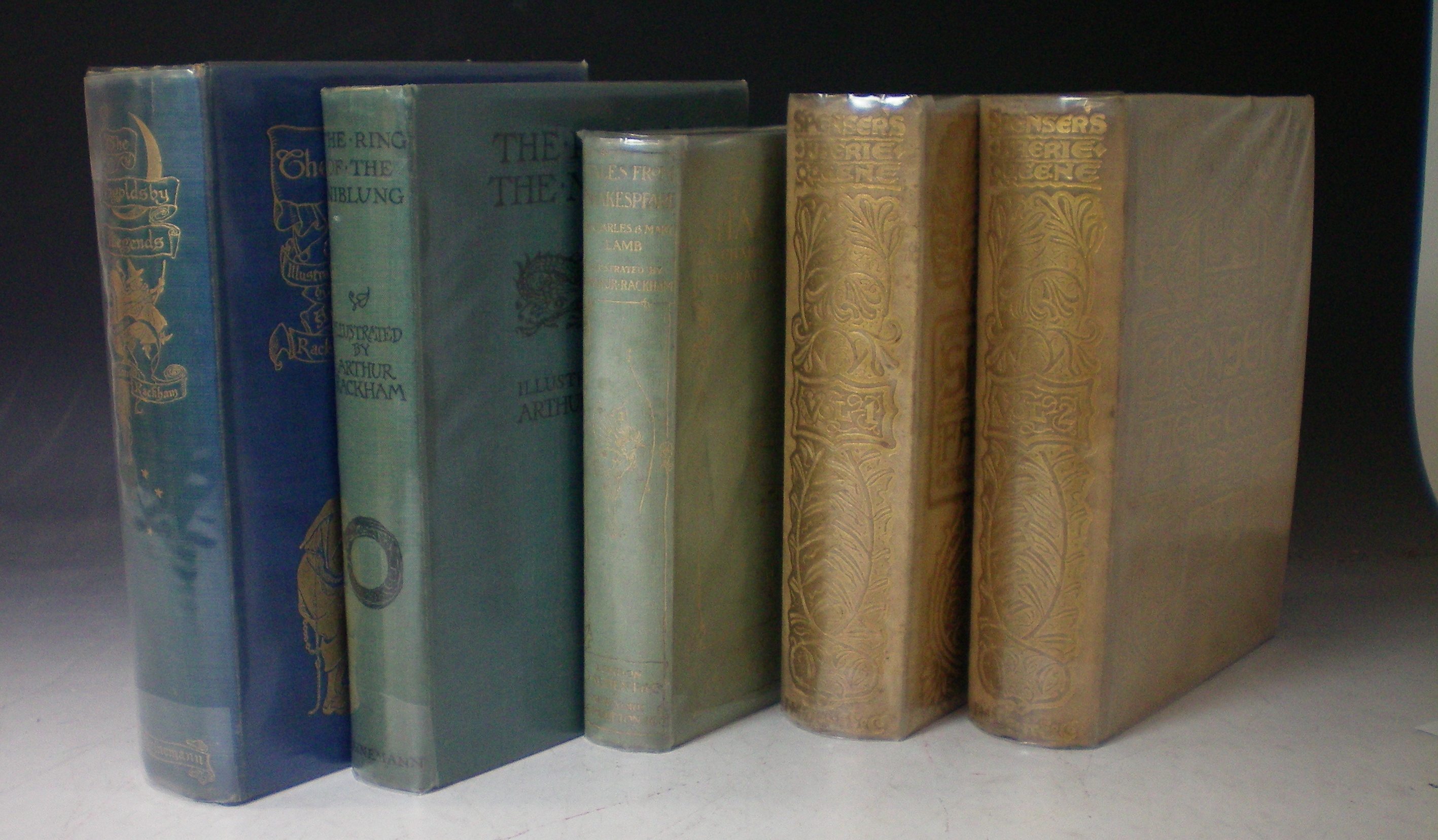 The Ingoldsby legends. London, 1909. 8vo, 24 tipped in colour plates, original blue cloth gilt, some fading to backstrip, some foxing to page edges; [Idem] The Rhinegold & the Valkyrie. London, 1939. 8vo, colour plates, original cloth, some fading to backstrip, interior clean; Lamb, Charles & Mary Tales from Shakespeare. London: J.M. Dent, 1909. 8vo, colour plates, original cloth gilt, t.e.g., browning to endpapers, some discolouration to endpapers; Spenser, Edmund Faerie Queene. London, 1897. 8vo, 2 volumes, one of 1250 volumes, illustrated by Louis Fairfax-Muckley, original cream cloth gilt, inner hinge splitting, some discolouration to cloth, previous owner's ink inscription (5)