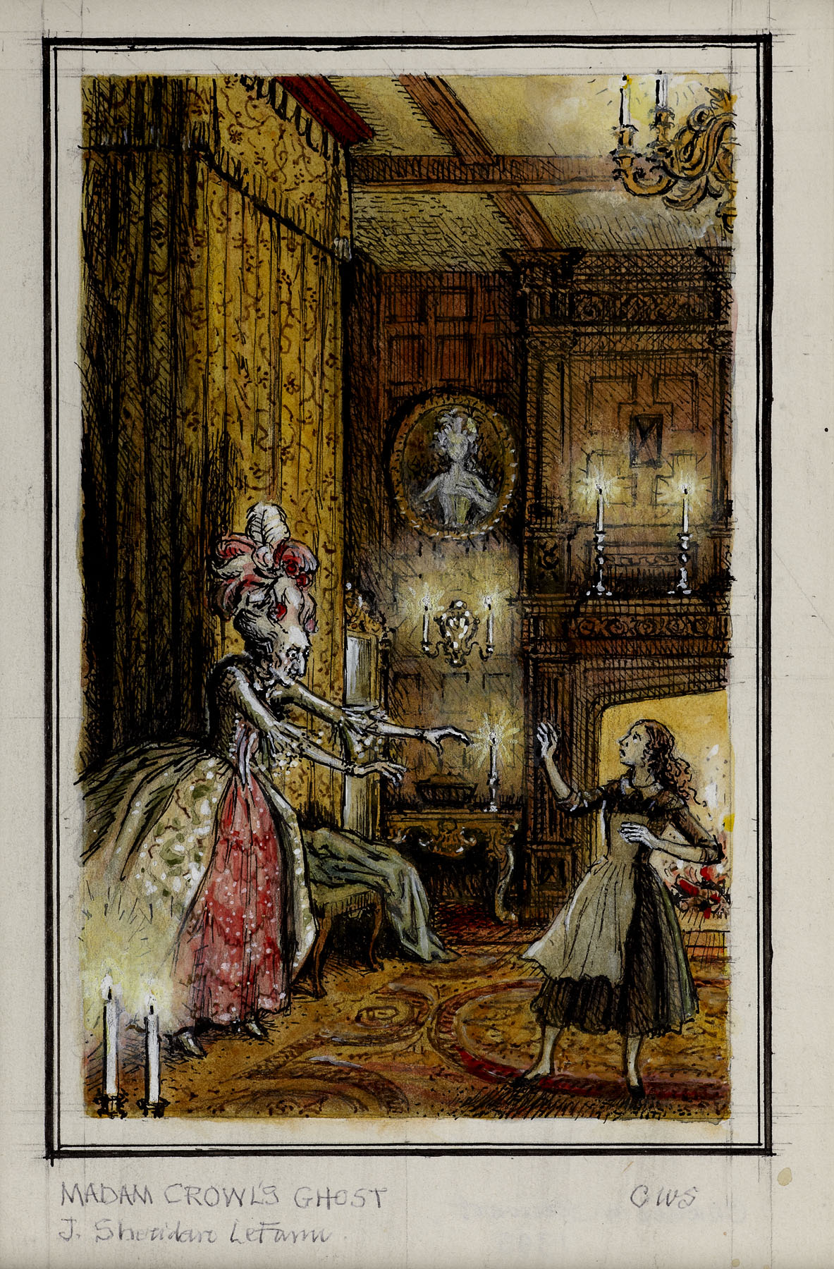 The first, captioned Canon Alberic's scrap book, depicts a scene from a story by M.R. James, in which an English collector is tormented by a mysterious demon that has lept from the pages of a seemingly beautiful scrap book he has just purchased. The second, captioned Madam Crowl's ghost, depicts a scene from a tale by J. Sheridan LeFanu.