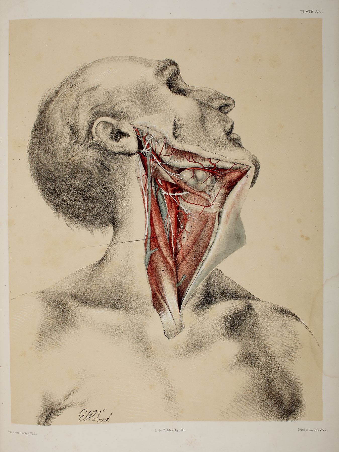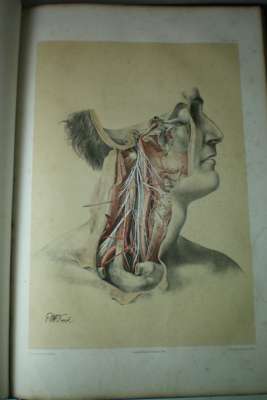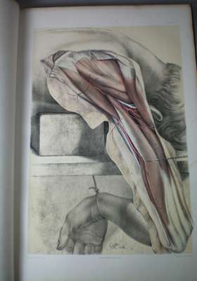 Illustrations of dissections... representing the dissection of the human body. London: James Walton, 1867. Folio & 8vo, 2 volumes [text volume & atlas], 58 colour plates in folio volume, contemporary half morocco gilt, rubbed at edges, section of backstrip from atlas missing, foxing, waterstains to outer edge of plates, previous ink inscription to endpaper of text volume (2)