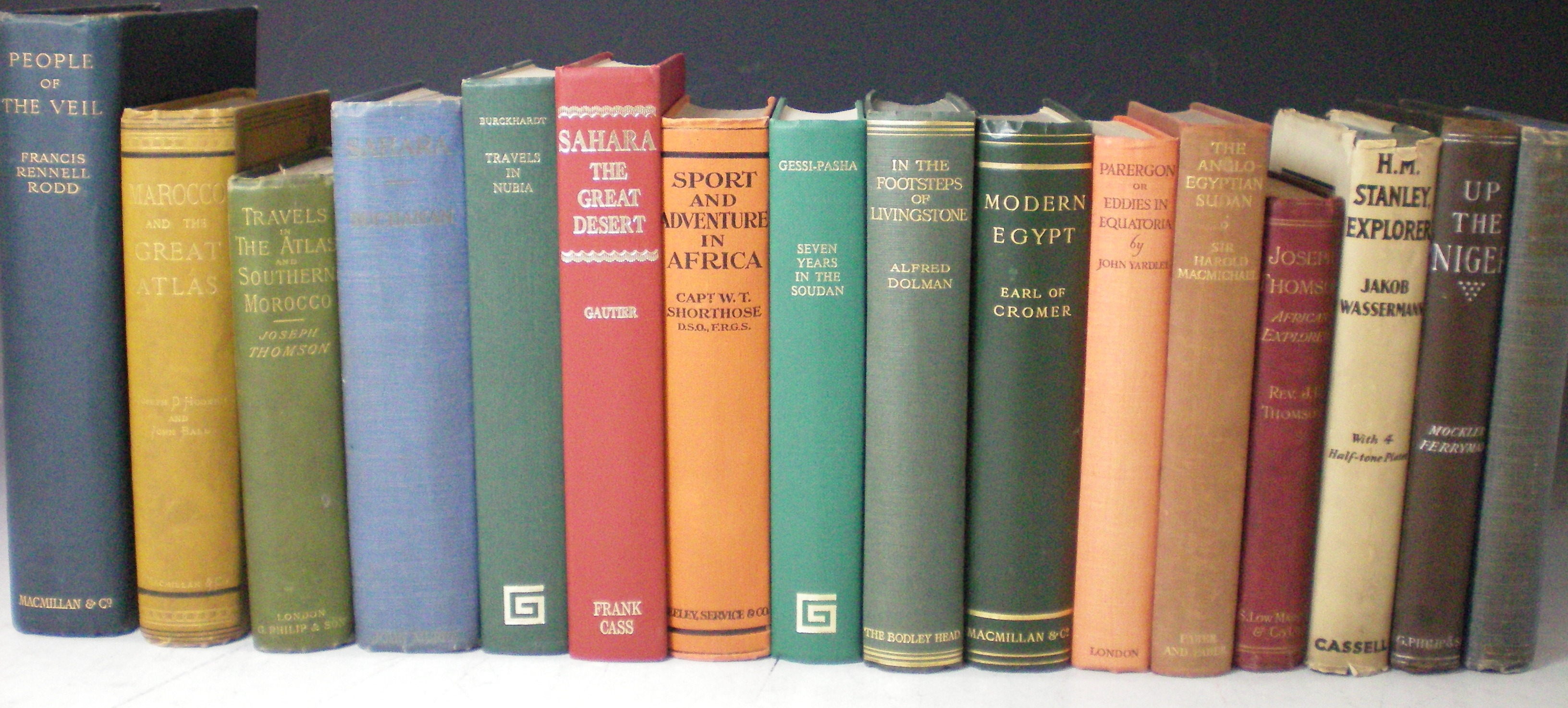 People of the veil. 1926. Large 8vo; Hooker, J.D. and J. Ball Journal of a tour in Marocco and the Great Atlas. 1878. 8vo, folding frontispiece, plates; Thomson, J. Travels in the Atlas and Southern Morocco. 1889. First edition, 8vo, folding maps, plates; Buchanan, A. Sahara. 1926. 8vo, plates; Burckhardt, J.L. Travels in Nubia. 1968. 4to; Gautier, E.F. Sahara, the great desert. 1970. 8vo; Gessi, R.Seven years in the Soudan. 1892. 8vo, plates; Shorthorse, W.T. Sport & adventure in Africa. 1923. 8vo, plates, folding map; Cromer, Earl of Modern Egypt. 1911. 8vo; Dolman, A. In the footsteps of Livingstone. 1924. 8vo, plates; and 36 others, original cloth (46)