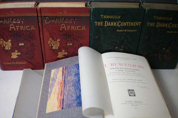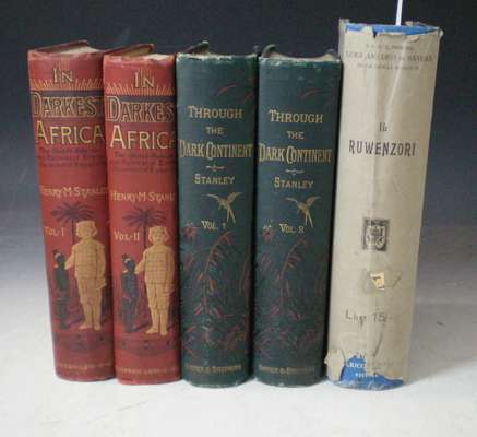 In darkest Africa or the quest rescue and retreat of Emin, governor of Equatoria. London: Sampson Low, 1890. Fourth edition, 2 volumes, 8vo, plates, folding maps, plates, original pictorial cloth, one frontispiece repaired; Idem Through the dark continent. New York: Harper & Bros., 1878. 2 volumes, 8vo, plates, maps, [2 folding, in pockets at end], original green pictorial cloth gilt; slightly rubbed; Filippi, Filippo de -- Amedeo of Savoy, Prince Luigi Il Ruwenzori. Viaggio de esplorazione. Milan: A. Hoepli, 1908. 4to, plates, folding panoramas, original cloth, dust-jacket slightly frayed (5)