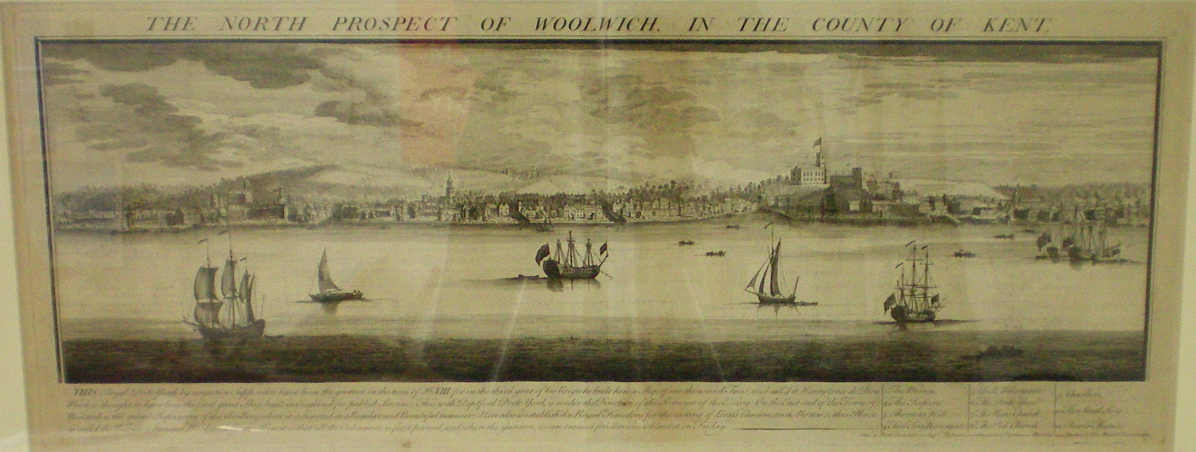 The North prospect of Woolwich in the county of Kent. London, c.1772. Approx. 33 by 84 cm, framed [Hogarth frame] and glazed, central fold visible