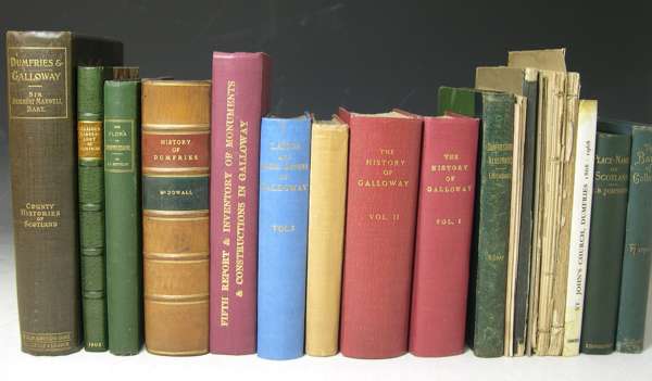 Mineralogical description of the county of Dumfries. Edinburgh, Bell & Bradfute, 1805. First edition, 8vo, folding map and 4 engraved plates, half-title, advertisement leaf, modern green morocco-backed marbled boards, McDowall, William History of the burgh of Dumfries. Edinburgh, 1867. 8vo, additional lithographed title and frontispiece, half calf gilt; [Galloway] History of Galloway. Kirkcudbright: J. Nicholson, 1841. 2 volumes, 12mo, 2 folding engraved maps, cloth; Scott-Elliot, G.F. The flora of Dumfriesshire. Dumfries, 1896. 8vo, folding map in pocket, original cloth; Maxwell, H. A history of Dumfries and Galloway. 1896. 4to, number 79 of 100 copies on hand-made paper, 2 maps in pocket, one map split at folds, original buckram, t.e.g., spine gilt.; Wood, J.M. Witchcraft and superstitious record in the S.W. district of Scotland. Dumfries, 1911. 8vo, original cloth, spine faded; and 16 others, pamphlets and books, most relating to Dumfriesshire (23)