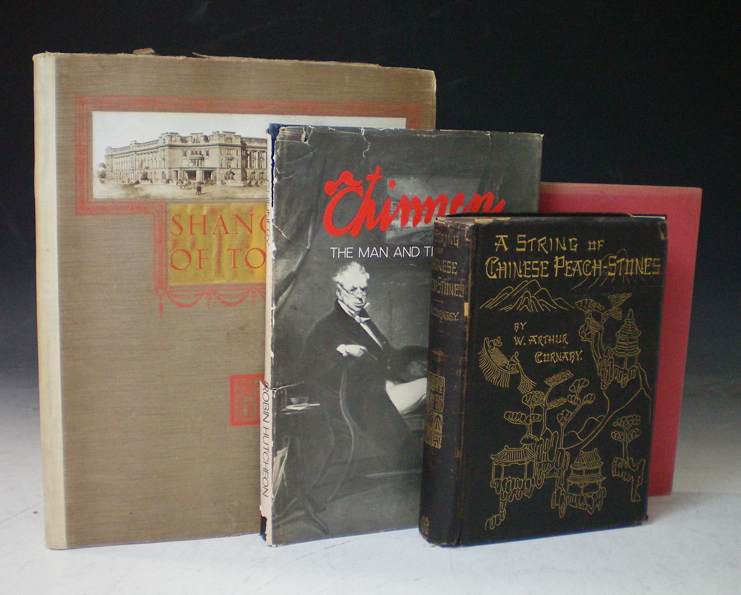 Shanghai of today. A souvenir album of thirty eight Vandyke prints of the model settlement. Shanghai: Kelly & Walsh, 1927. 4to, plates, inscription on half-title, original wrappers frayed and slightly soiled, rebacked; Cornaby, W.A. A string of Chinese peach-stones. London, 1895. 8vo, frontispiece, original cloth, very worn; Hutcheon, R. Chinnery, the man and the legend. 1975. 8vo, illustrations, original cloth; and 1 other (4)