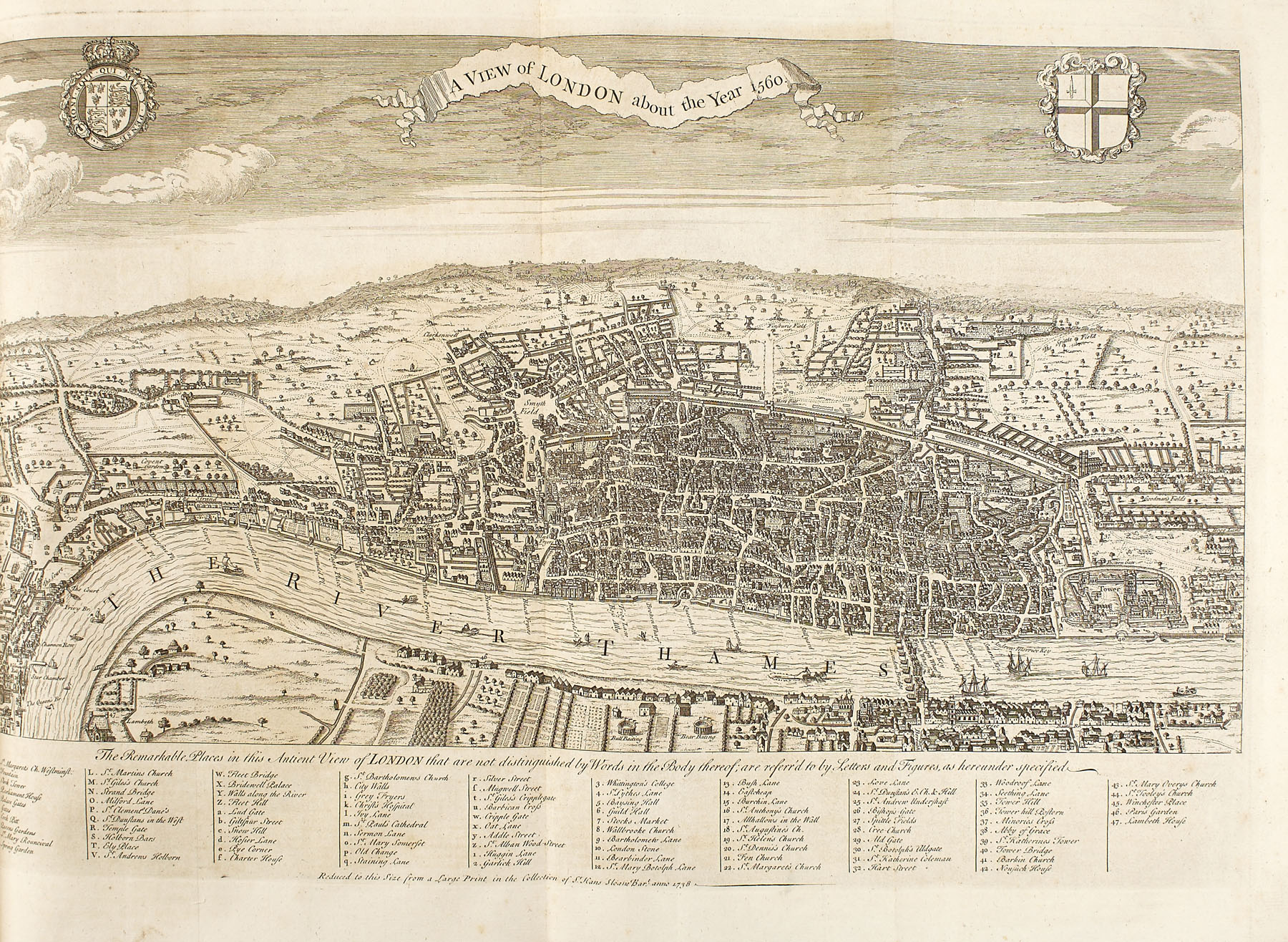 The history of London. London: printed for T. Osborne, 1756. Second edition, folio, 2 volumes, frontispiece in each volume, & 119 plates [some folding], contemporary calf, rebacked, replacement endpapers, some worming to first 10 leaves [including folding frontis.] of volume II (2)