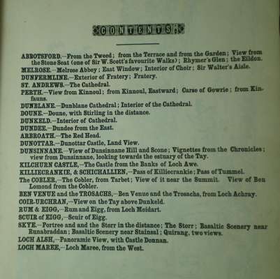 Note: Very rare. Murray produced another rare book of letterpress and lithographs under the title Scenery of the Highlands and islands of Scotland, lithographed by S. Leith, Banff, from drawings in outline, by Lieut. Colonel W. Murray, Younger of Ochtertyre, which was published, undated, in Perth by Morison, Junr. & Co. This work had 82 pages of text and 26 leaves of plates, unlike the present work which has 42 leaves of plates and no text except for title and Contents leaf. Only one copy of this work is recorded in the U.K. (N.L.S.). Another work with a similar title Sketches of scenes in Scotland, drawn in outline by Lieut. Col. Murray, with historical and descriptive illustrations by D.M. was published in Perth, undated, but with the date of 1834 ascribed to it by the NLS.