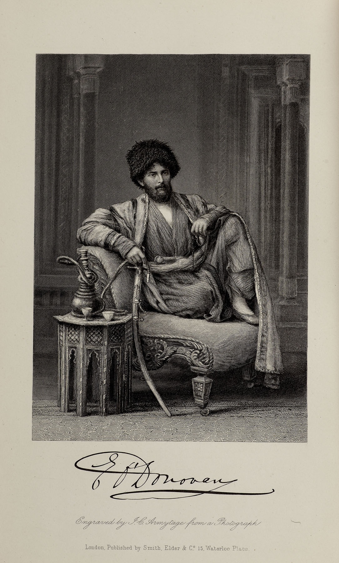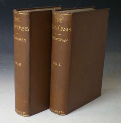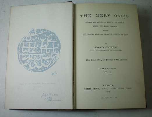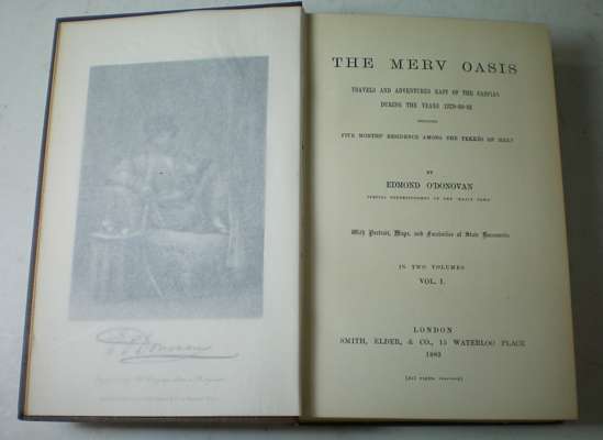 The Merv oasis. London: Smith, Elder & Co., 1882. 8vo, 2 volumes, half titles, frontispiece in each volume, 14 plates [including plans, many folding], folding map in pocket at rear of volume two, original brown cloth gilt, some light rubbing to head and tail of backstrip, interiors very clean, previous ink inscription to endpaper of each volume (2)