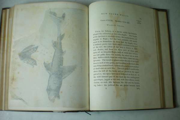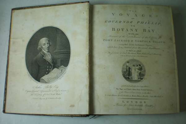 The voyage of Governor Philip to Botany Bay. London: J. Stockdale, 1789. 4to, engraved portrait, title and 53 (of 54) engraved maps and plates, contemporary calf, also lacking part of the map at p. 122-123, title cropped and stained; heavy browning, spotting and offsetting to most plates and text, rebacked, rubbed, lacking plate of Watt's shark, folding maps with tear