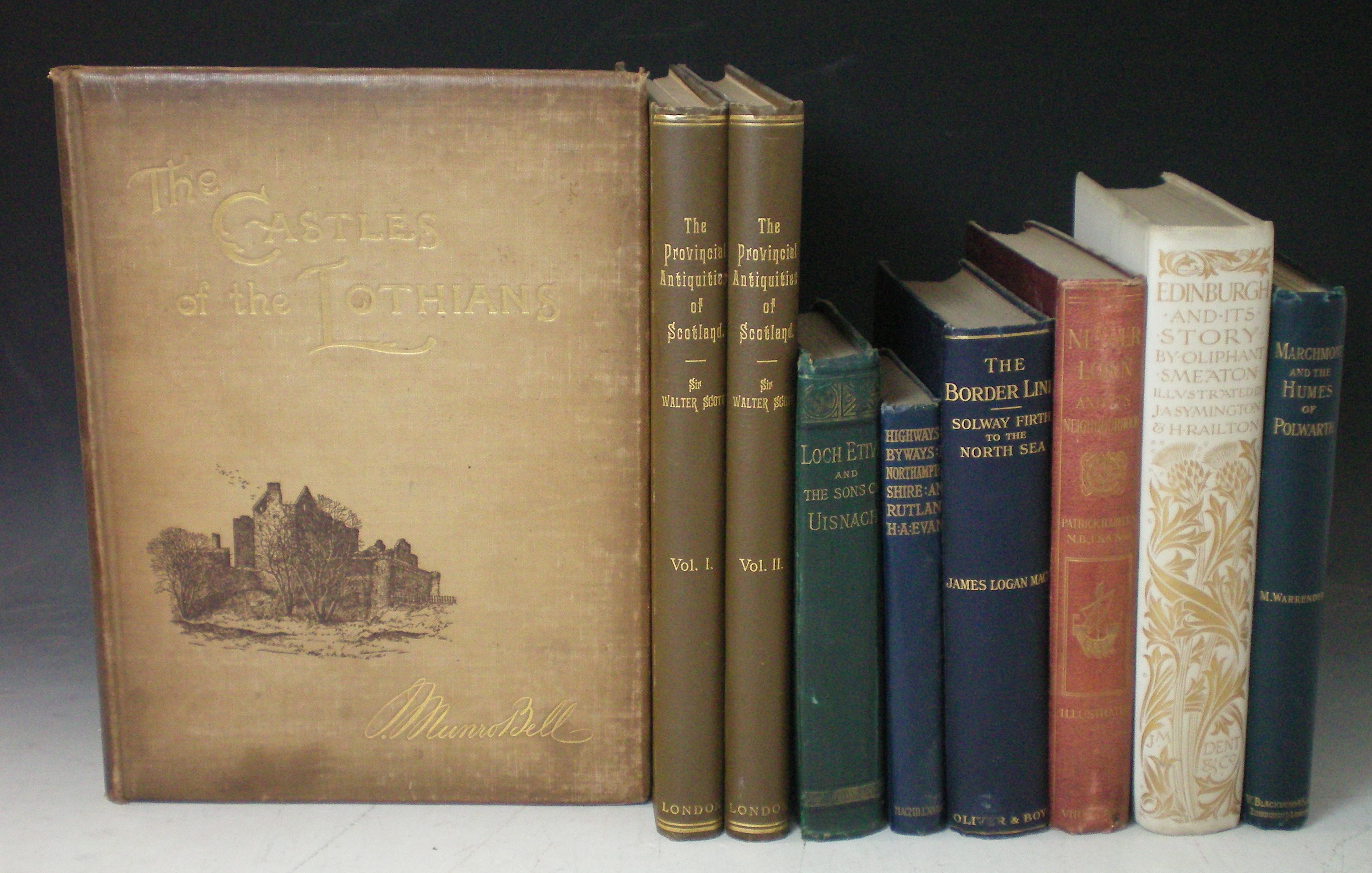 Provincial antiquities and picturesque scenery of Scotland. London, 1826. 4to, 2 volumes, plates, original brown cloth gilt, inner hinges strengthened, some pages loose; Bell, J. Munro The castles of the Lothians. Edinburgh, 1893. 4to, frontispiece, plates, original brown cloth gilt, some discolouration to backstrip, interior clean; Warrender, M. Marchmont and the Humes of Polwarth. Edinburgh, 1894. 8vo, frontispiece, plates, original cloth gilt, bookplate; Anderson, D. Brown The vale of Anwoth. Edinburgh, 1899. 8vo, frontispiece, original cloth gilt, fading to backstrip, foxing to endpapers; Oliver, J. Rutherford Upper Teviotdale and the Scotts of Buccleuch. Hawick, 1887. 8vo, frontispiece, original cloth gilt , some rubbing to edges; Mack, James Logan The border line. Edinburgh, 1924. 8vo, frontispiece, plates, original cloth gilt; Gillies, Patrick H. Netherlorn, Argyllshire and its neighbourhood. London, 1909. 8vo, frontispiece, plates, original cloth gilt, backstrip faded, foxing; Smeaton, Oliphant Edinburgh and its story. London, 1904. 8vo, number 119 of 250 copies, frontispiece, plates, original cream cloth gilt, some foxing to endpapers; and 9 others (18)